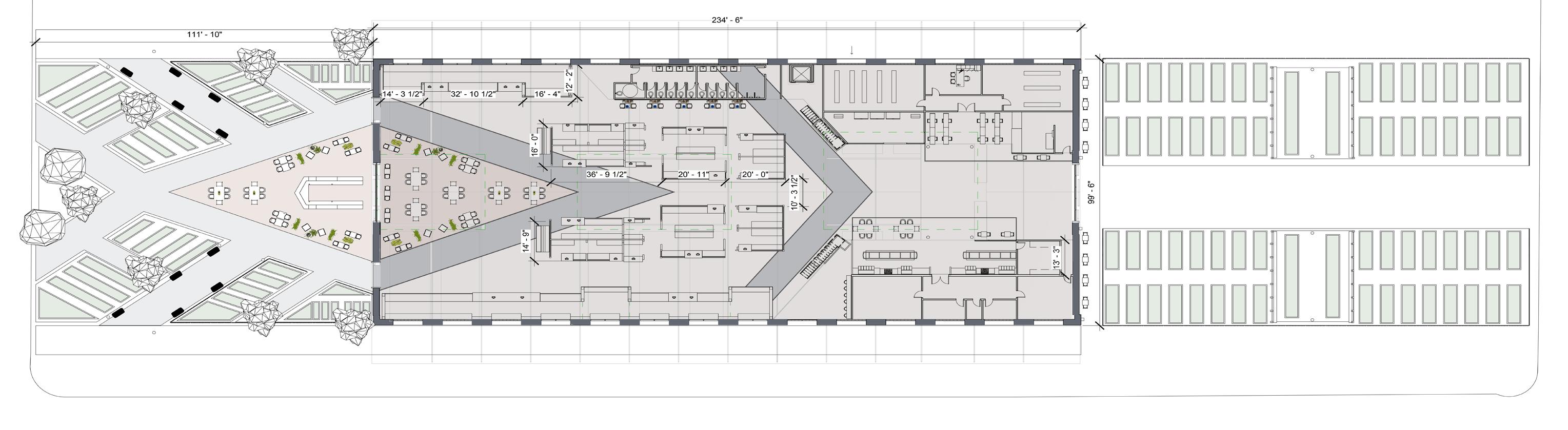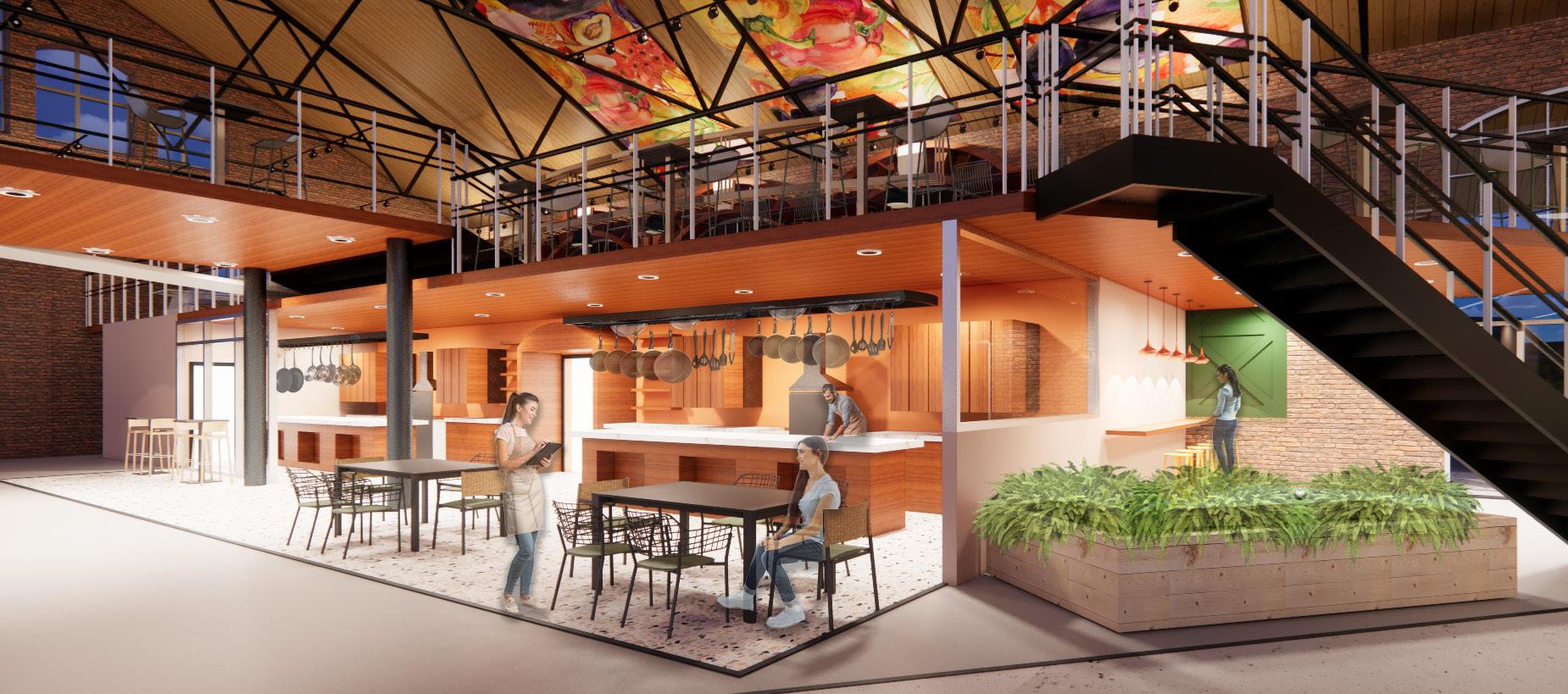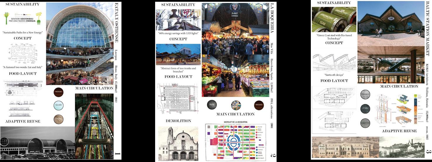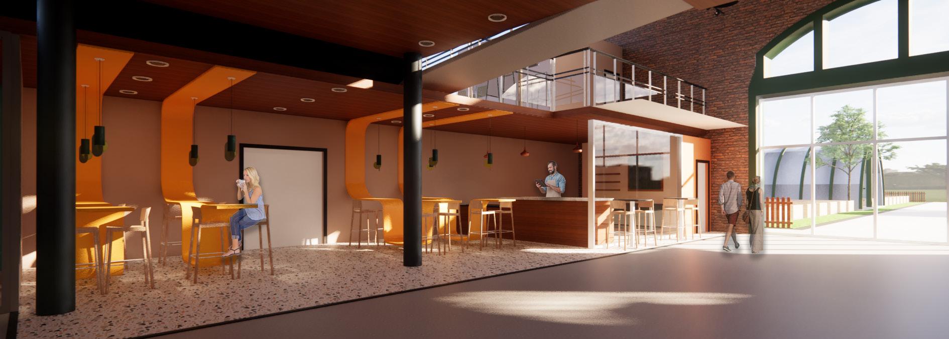 VIEWS TO EXTERIOR TO ENCOURAGEWELL-BEINGPSYCHOLOGICAL ACOUSTIC PANELS ATTACHED TO ROOF COURTYARD MEANT TO UNITE THROUGHCOMMUNITYDEMOS DECIDUOUS TREES USED FOR SHADING GREEN HOUSES USED FOR SUSTAINABLE STOCK GROWTH CLEARSTORY WINDOWS TO ALLOW NATURAL LIGHT INTO THE SPACE VENDOR STALLS USED TO PROMOTE LOCAL BUSINESSES FOOD VENDOR MODEL BAR PERSPECTIVE OPEN KITCHEN PERSPECTIVE LONGITUDINAL SECTION