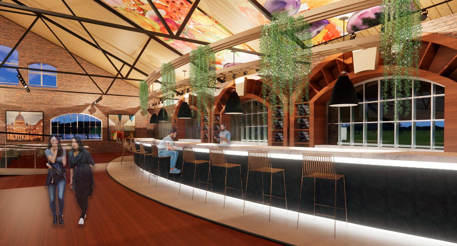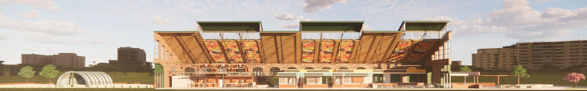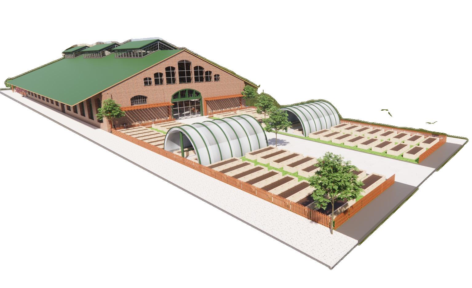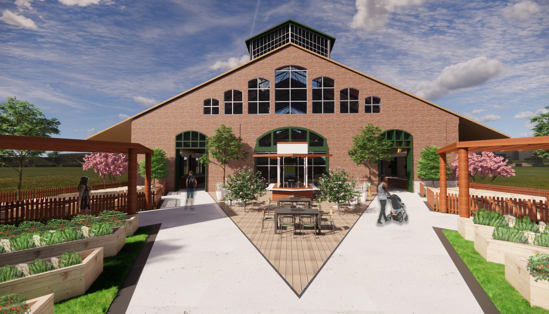 VIEWS TO EXTERIOR TO ENCOURAGEWELL-BEINGPSYCHOLOGICAL ACOUSTIC PANELS ATTACHED TO ROOF COURTYARD MEANT TO UNITE THROUGHCOMMUNITYDEMOS DECIDUOUS TREES USED FOR SHADING GREEN HOUSES USED FOR SUSTAINABLE STOCK GROWTH CLEARSTORY WINDOWS TO ALLOW NATURAL LIGHT INTO THE SPACE VENDOR STALLS USED TO PROMOTE LOCAL BUSINESSES FOOD VENDOR MODEL BAR PERSPECTIVE OPEN KITCHEN PERSPECTIVE LONGITUDINAL SECTION