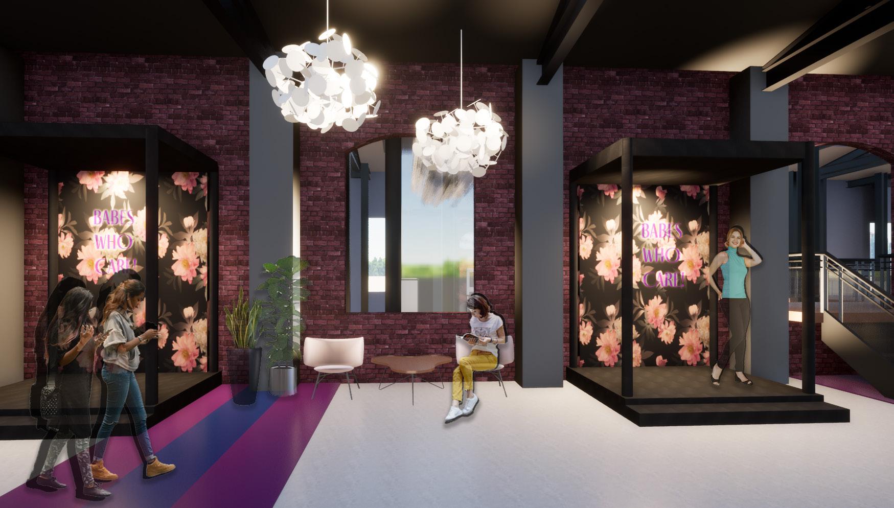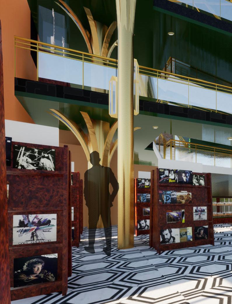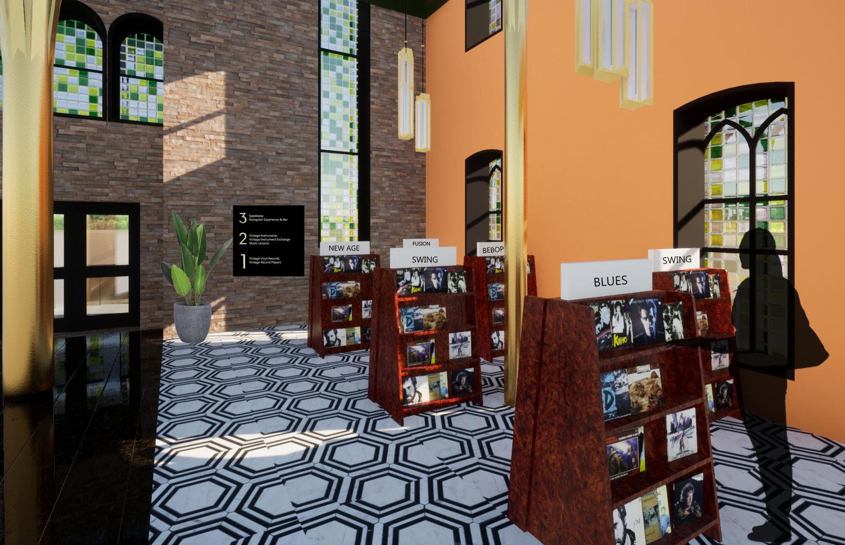 The materials used for Black & Brass promote contrast and comfortability. This strategy becomes more obvious to occupants as they travel through the space. The main color palette uses greens and yellows to draw the occupant’s eye in. The warm tones of brown accent the boldness of the gold, and create an inviting atmosphere. Black then contrasts these two color stories and creates depth and mystery, which provides consumers with a perfect environment to explore new music and culture.