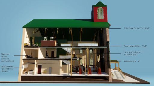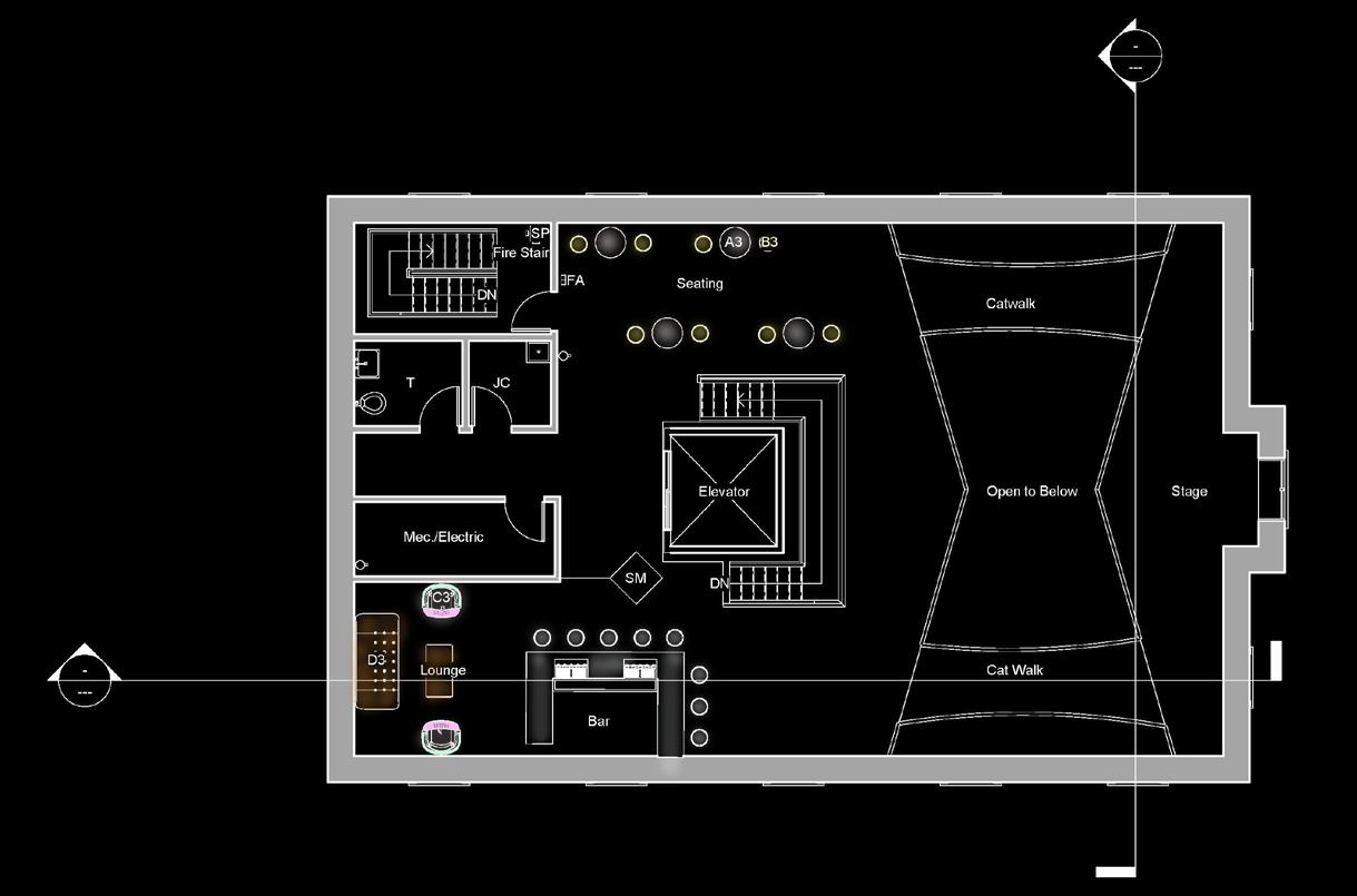 The Black & Brass Record Bar concept takes inspiration from syncopation and classic rhythmic patterns found in jazz music. The break or stress in the beat echoes through the forward and upward precession occupants follow within the architecture of the building. The design exhibits knowledge of adaptive reuse and honors the original structure by exposing the wooden truss system. Occupants are encouraged to learn more about Black culture through music education, art, and live performances which are showcased through each level of the building. This is meant to be a transformative experience for the residents of New Hope due to the lack of diversity within the community. Hope, Pennsylvania
