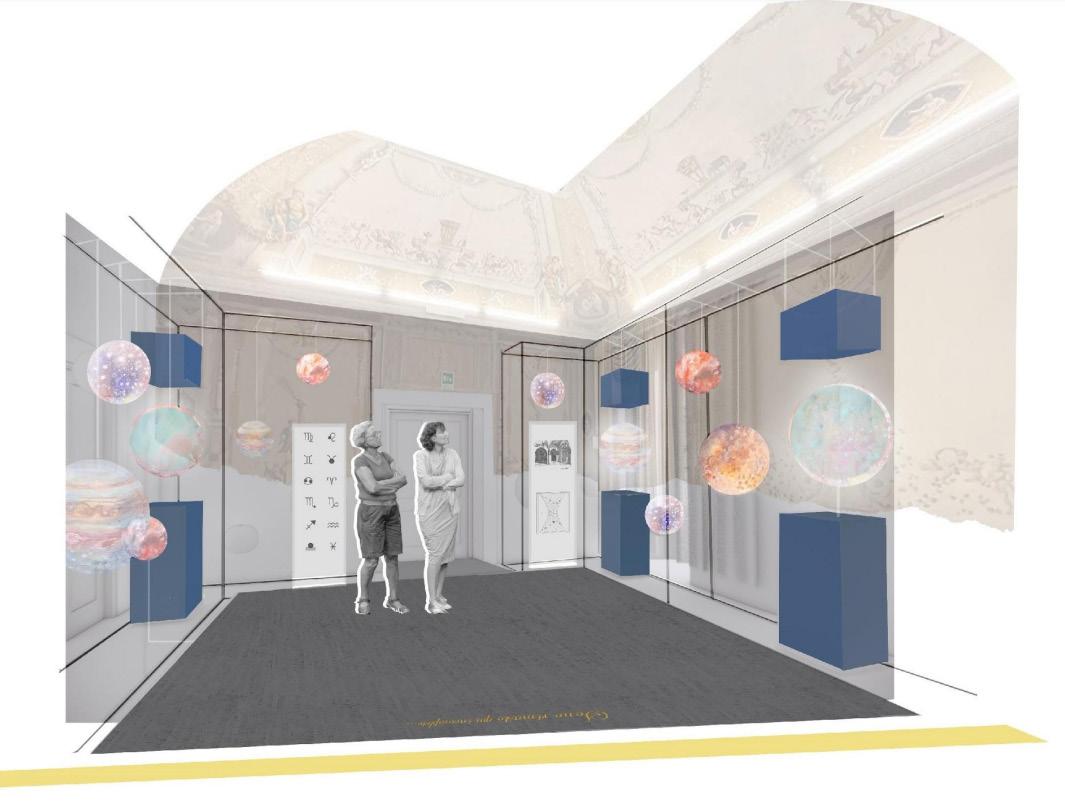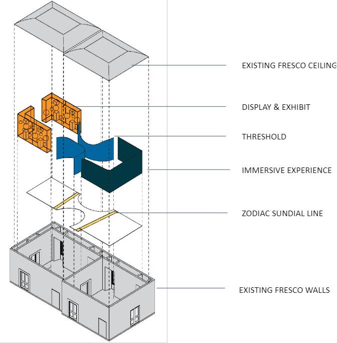 FALL 2021 The concept of Transcendere is to connect occupants to the built environment using the zodiac and original sun dial located in Fresco Rooms I and II. This adaptive reuse project is an educational and immersive experience for locals and intellects alike. The purpose of Transcendere is to educate patrons about the history of the zodiac and how the Romans used the theory to learn about space and time. The project uses contrasting spatial design for effective wayfinding while connecting each area using a “zodiac portal”. Stimulating all senses, Transcendere is a temporary exhibit that respects the antiquity, culture, and original frescos of Palazzo Taverna. CONCEPT SKETCH, DIAGRAMS & INSPIRATION PROGRAM CIRCULATION PORTAL FRESCO I PRECEDENTS CONCEPT DIAGRAMSSPATIAL ANALYSIS DIAGRAMS Rome,TranscendereItaly-Palazzo Taverna TRANSCENDERE