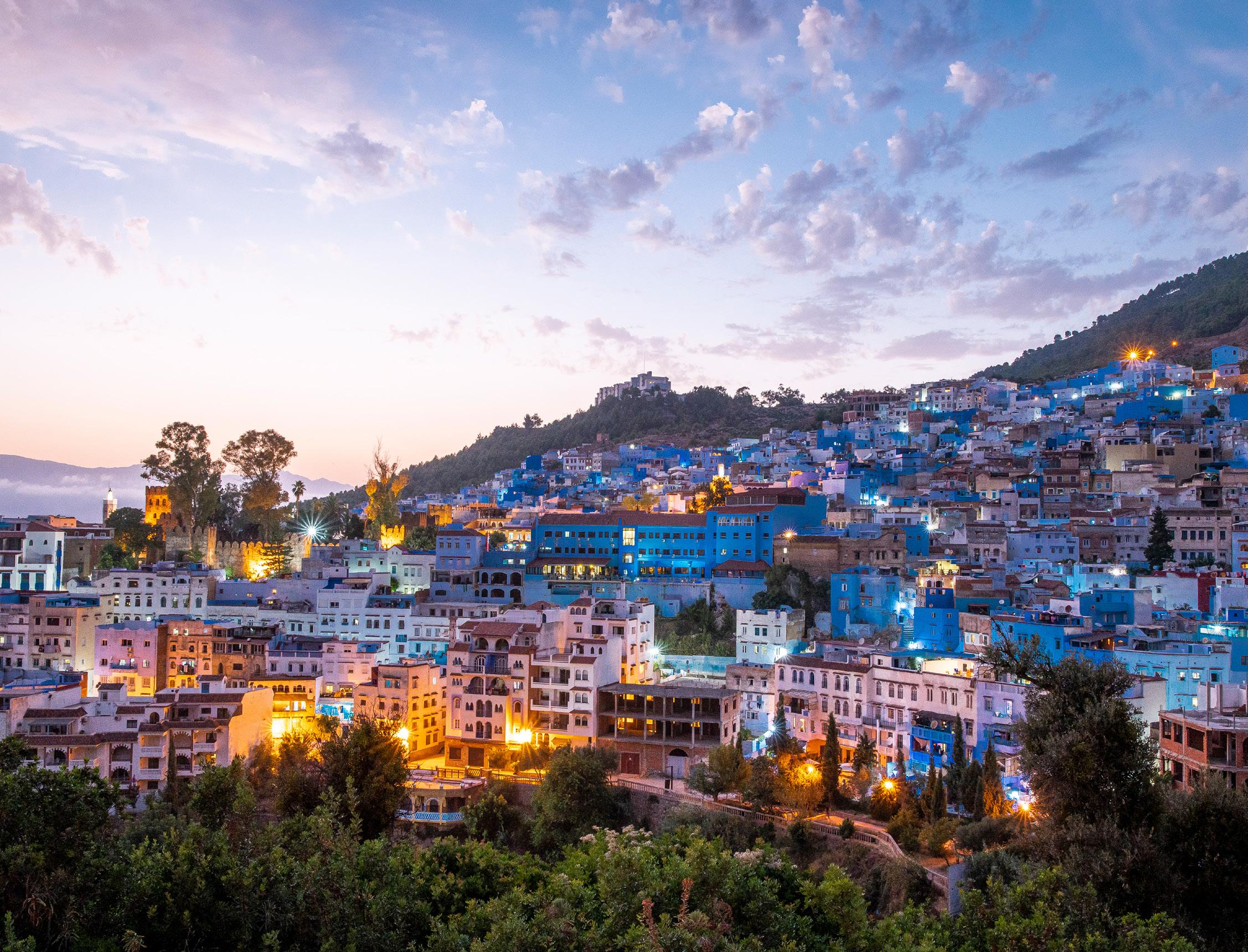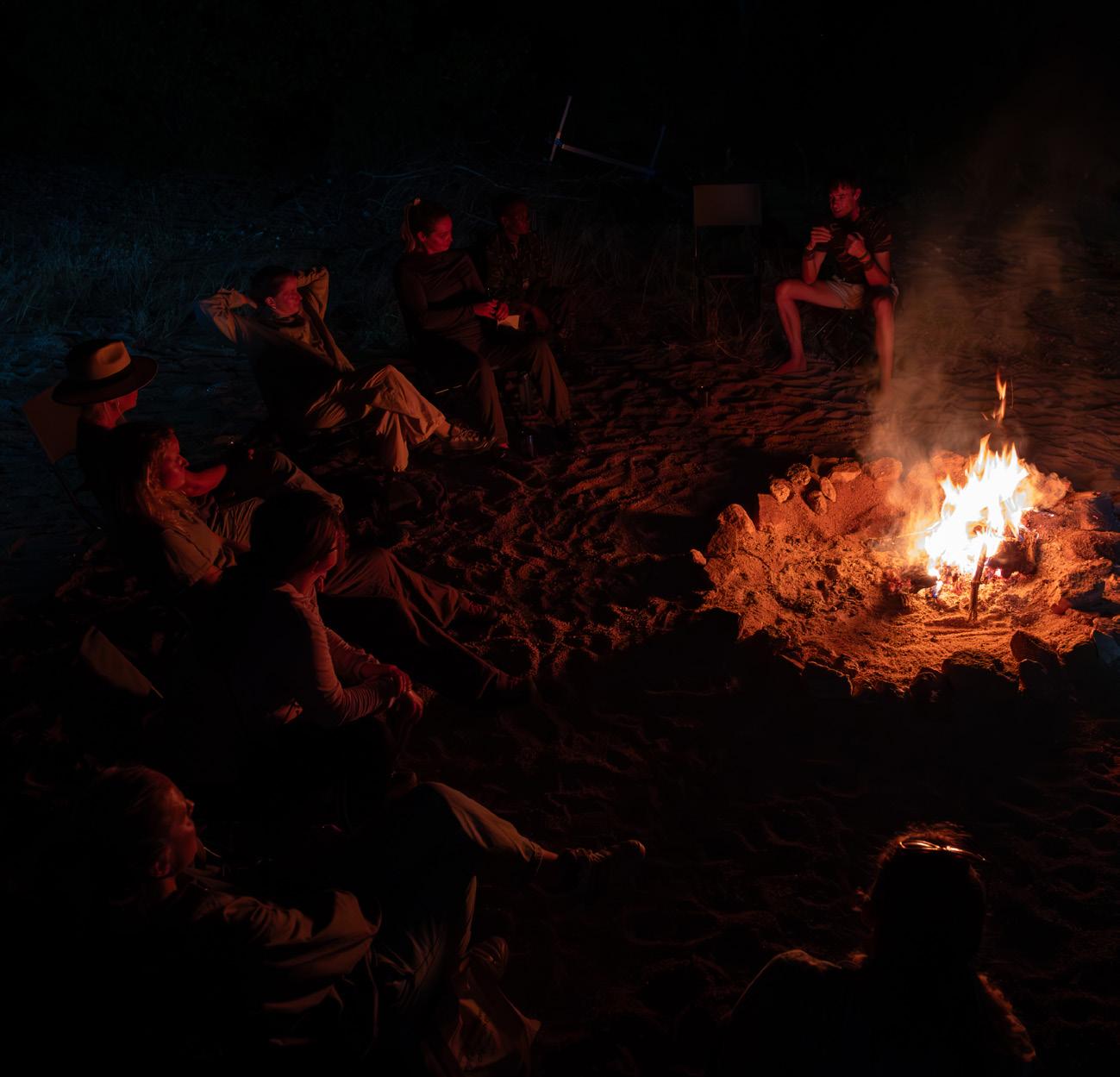 The sun has all but gone and occasional taller trees make impressive silhouettes against the electric blue dusk as we walk back to camp.