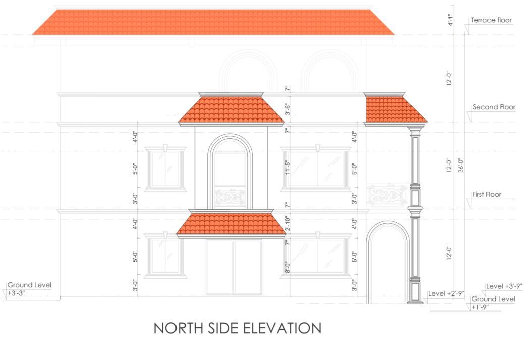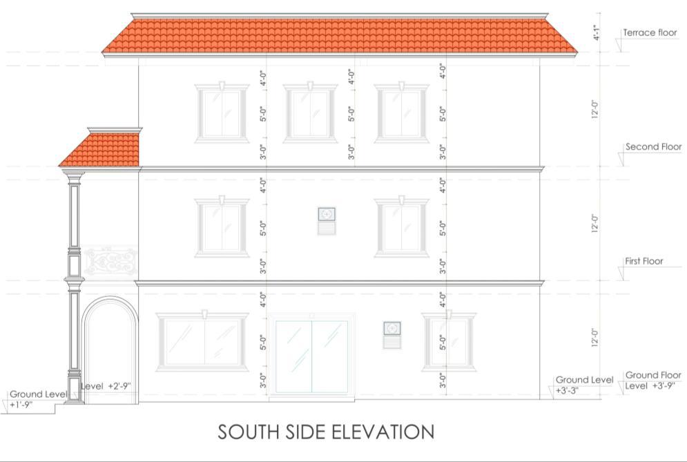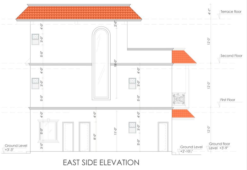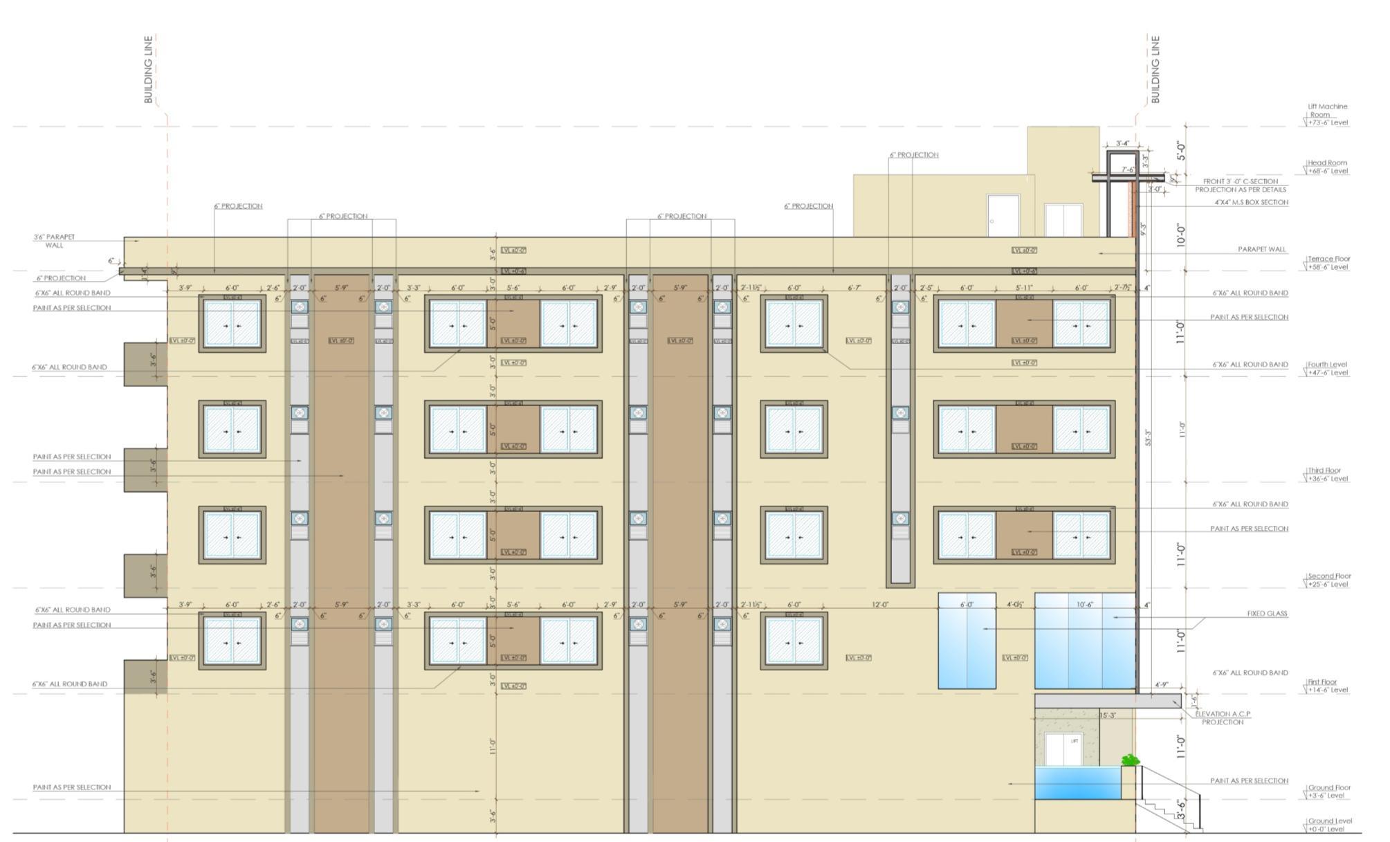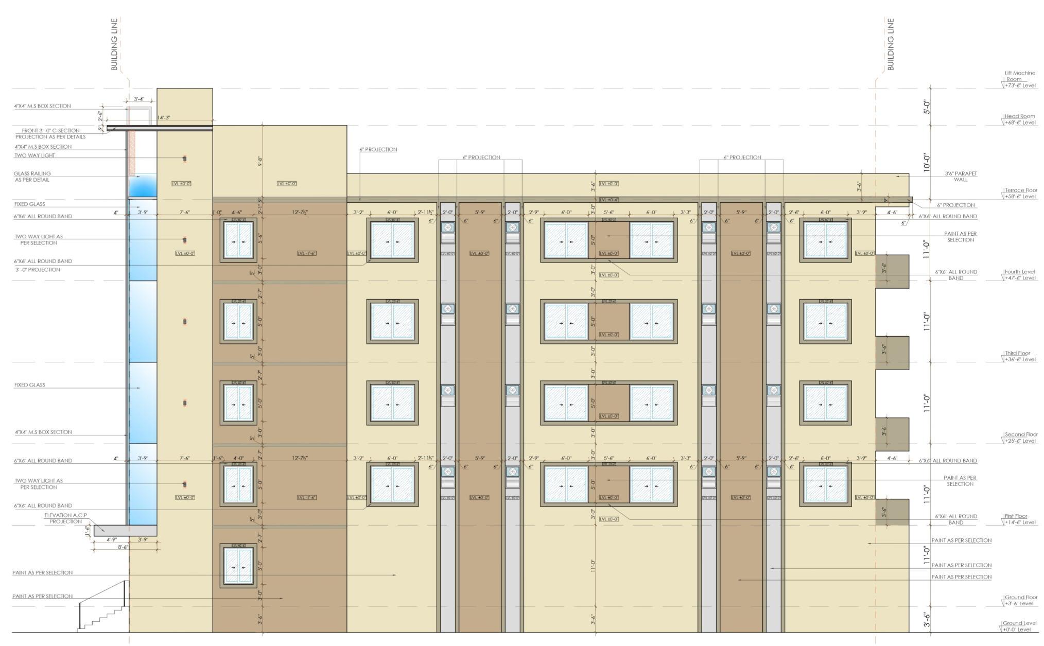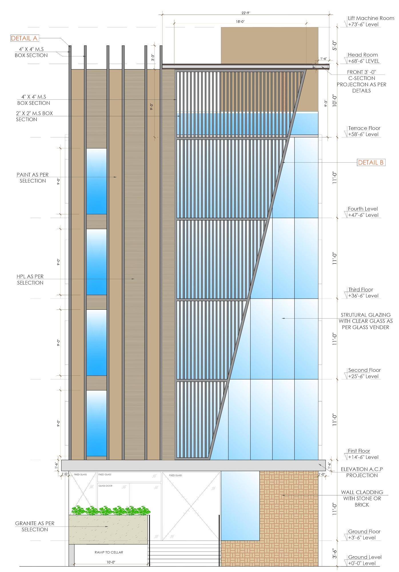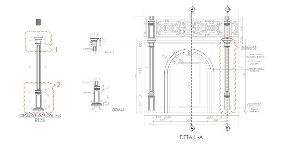 • I prepared the front elevation, detailed elevation drawings, and part plans for elevation detailing. My work focused on developing accurate façade treatments, material specifications, and construction-level details to guide site execution.
