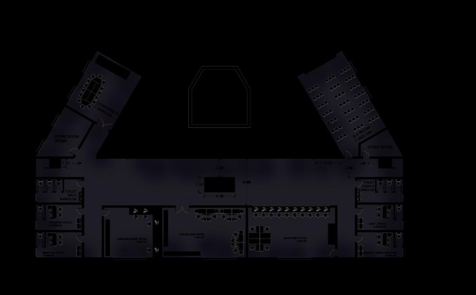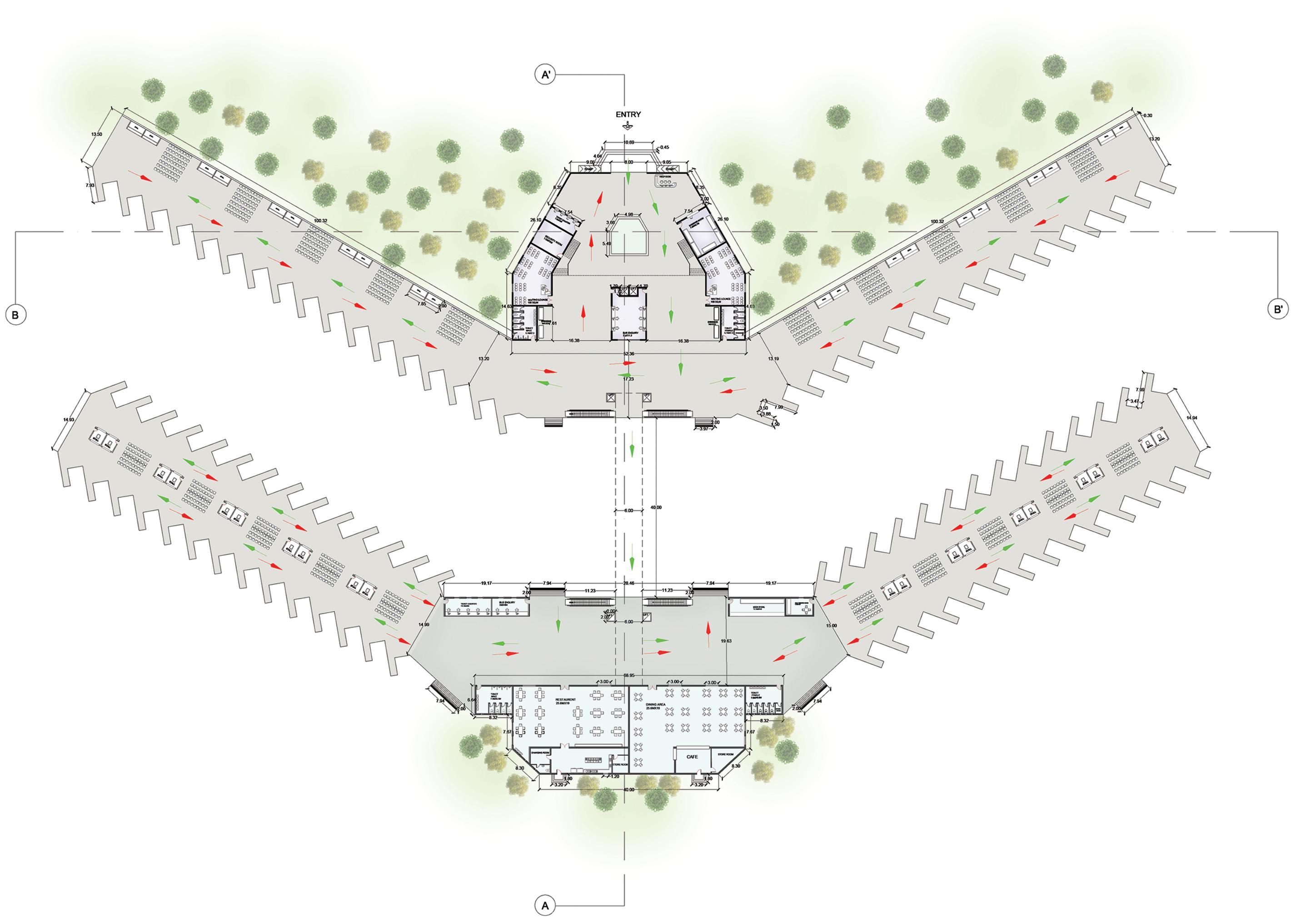 Centralized circulation with extended wings for admin and passenger areas, ensuring smooth movement and efficient space use.