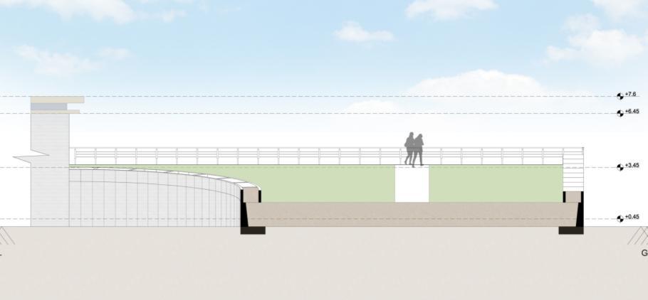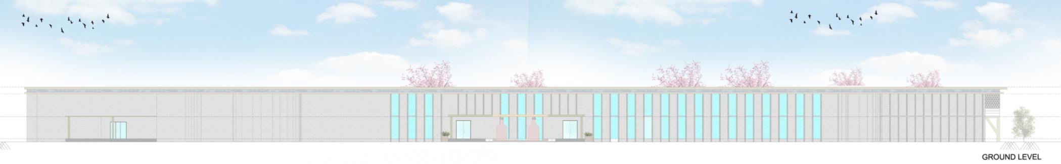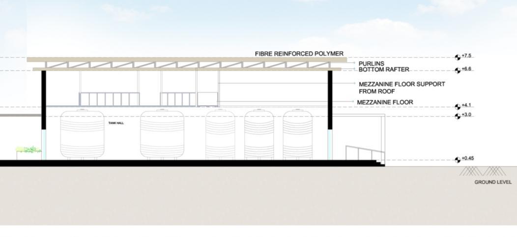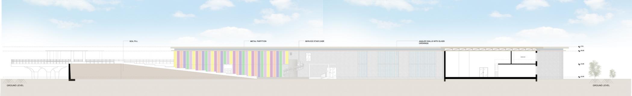 Longitudinal section showing internal spatial organization, roof profile, and natural lighting strategies for user comfort.