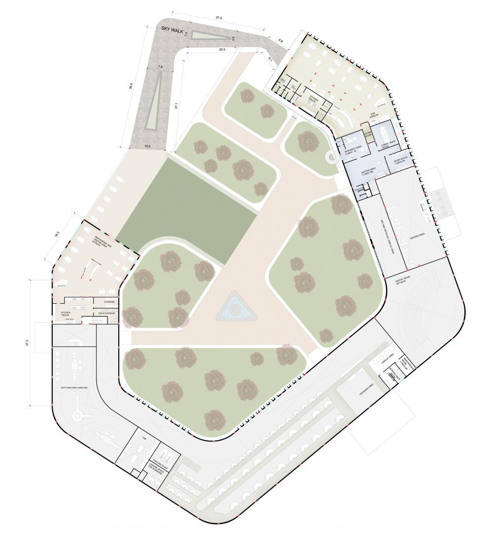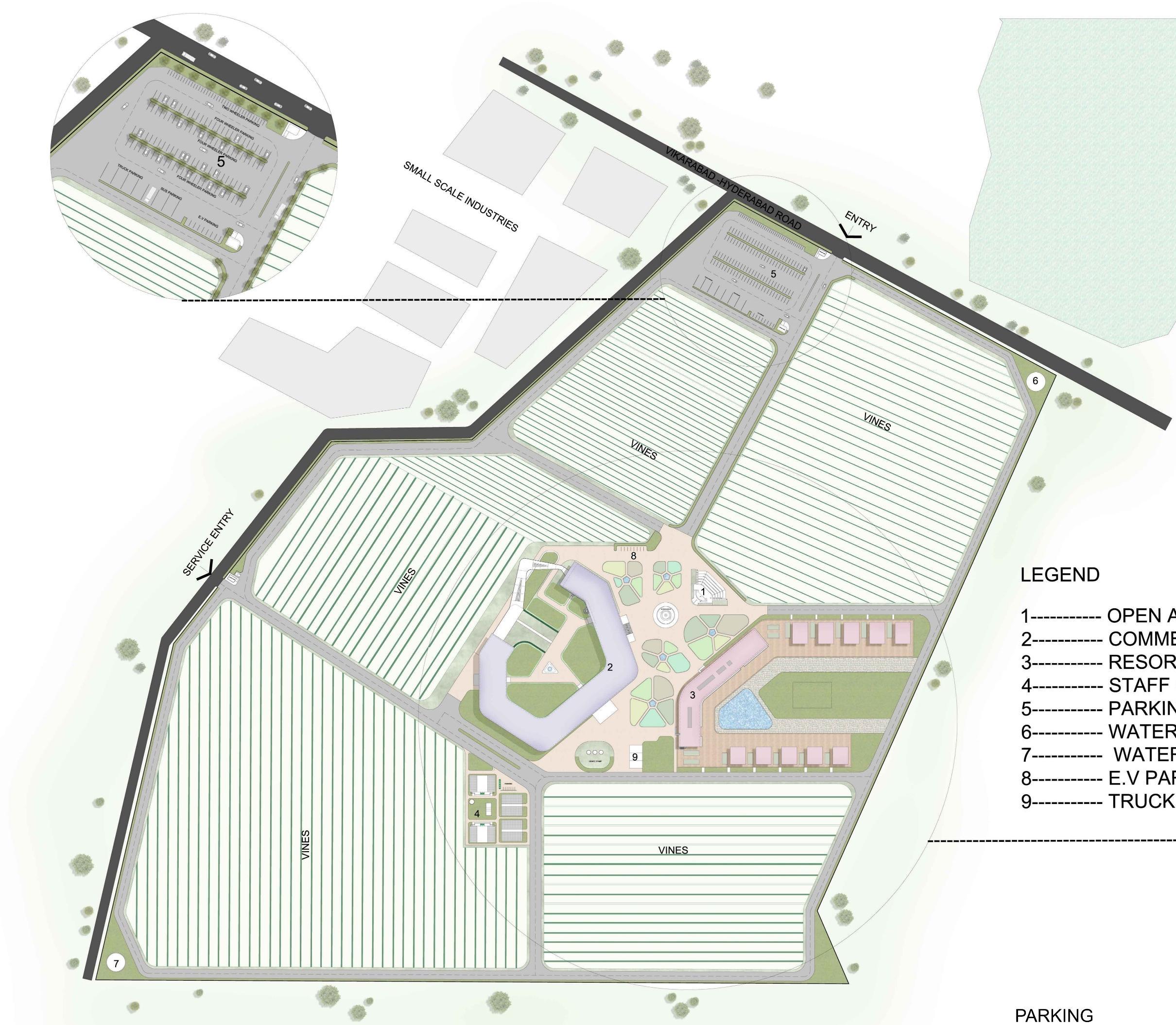 This thesis project focuses on the design and planning of a winery complex at Vikarabad that seamlessly integrates production, hospitality, and visitor experiences. The facility includes dedicated spaces for winemaking, grape crushing, wine tasting, visitor tours, and accommodations. The design aims to respond sensitively to the site’s topography, climate, and culture while creating a unique journey from vine to glass. The project explores innovative architectural solutions that enhance both the functional efficiency of wine production and the sensory experience of visitors.
