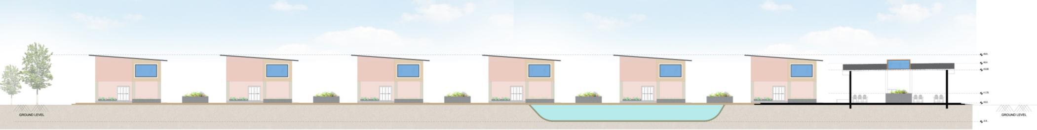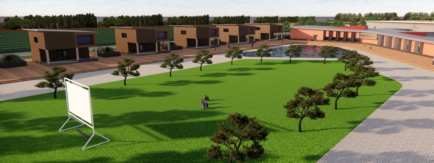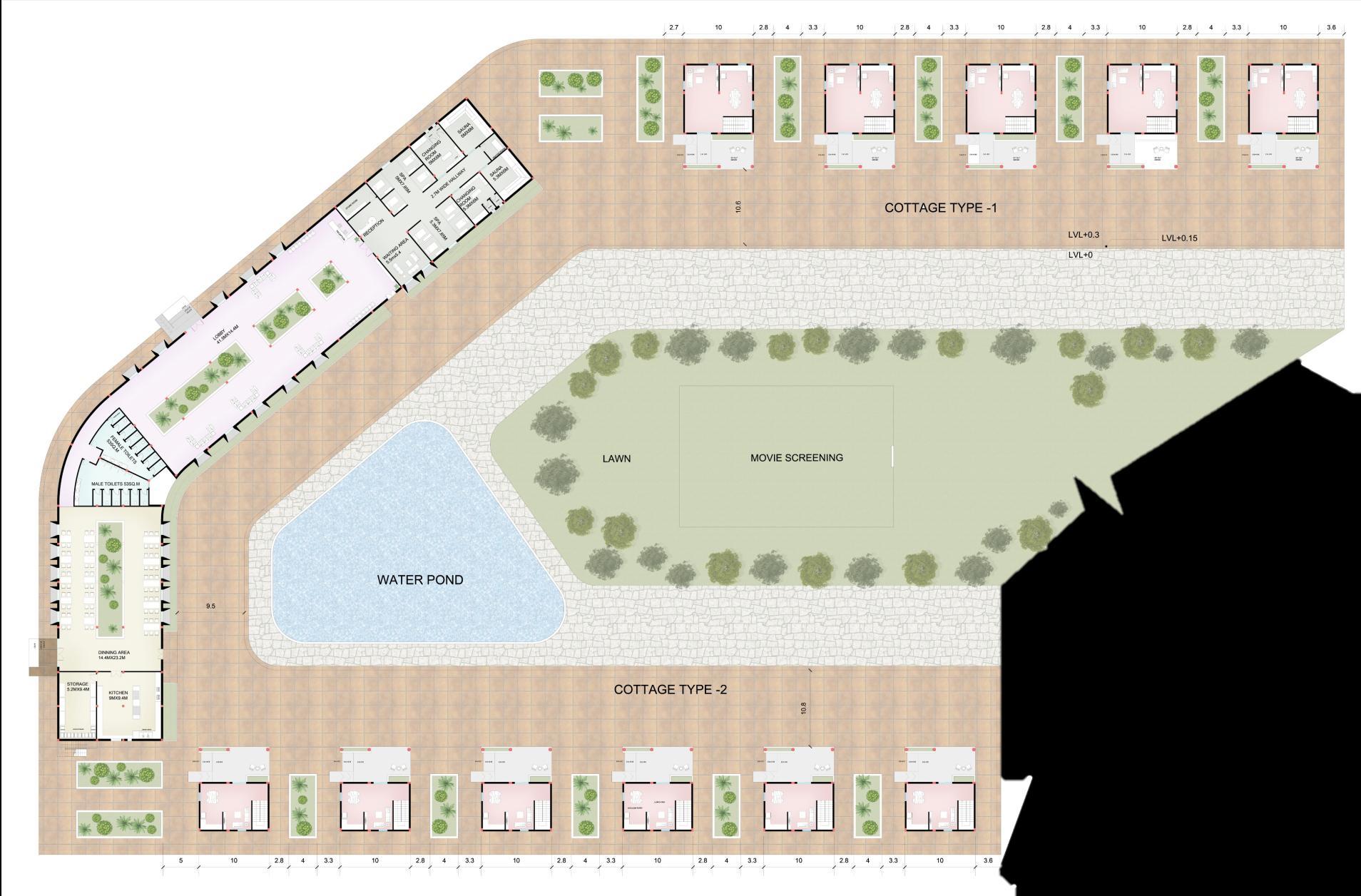 Resort Block’s tranquil guest experience with private cottages, central lawn, swimming pool, and outdoor movie area, blending with the vineyard landscape.