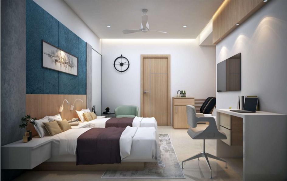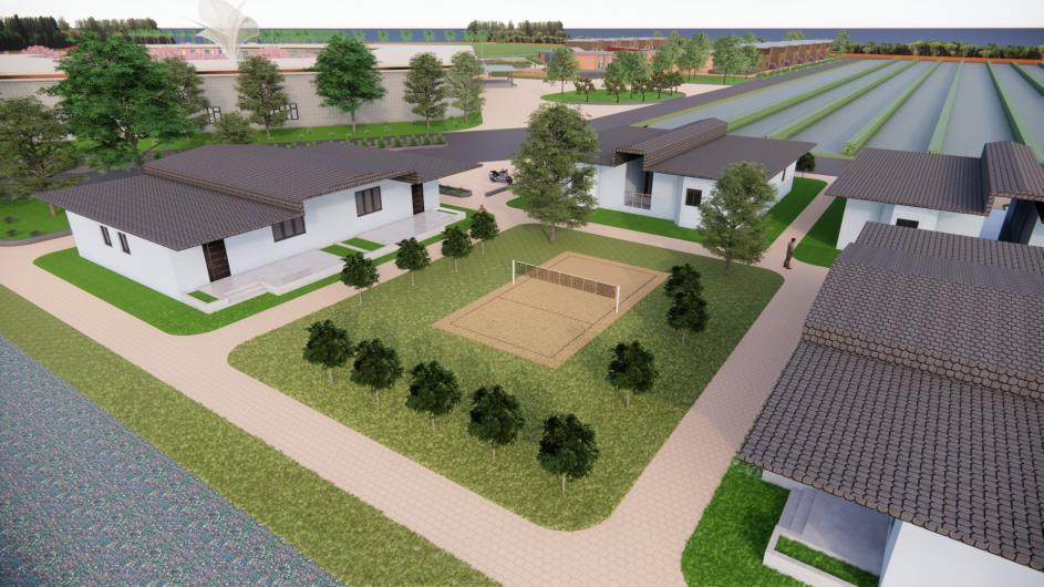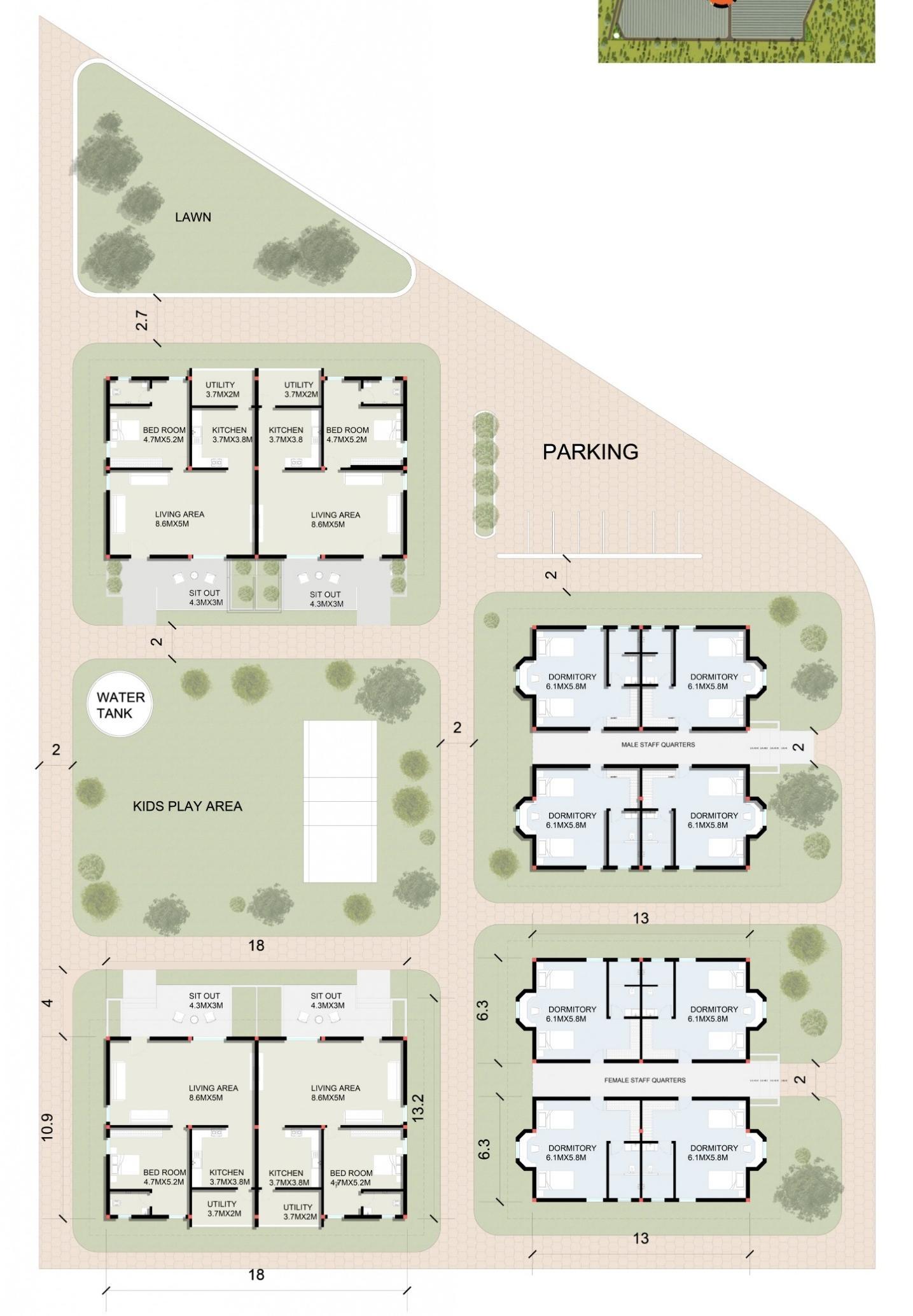 Staff Quarters offer well-planned residential units with shared amenities, kids play area, parking, and green relief spaces for employees.