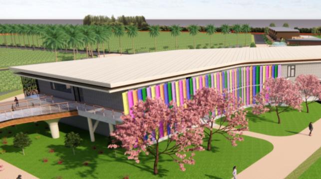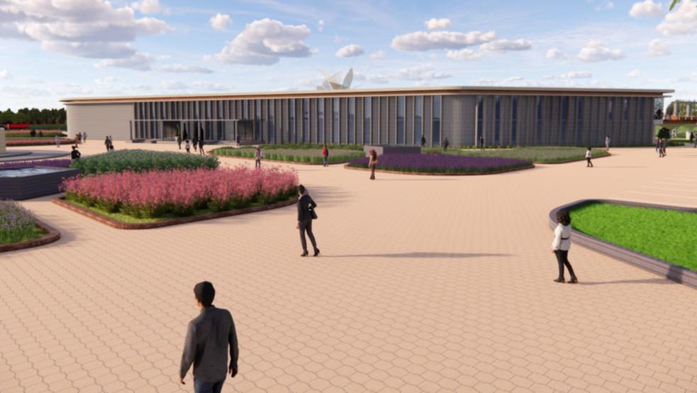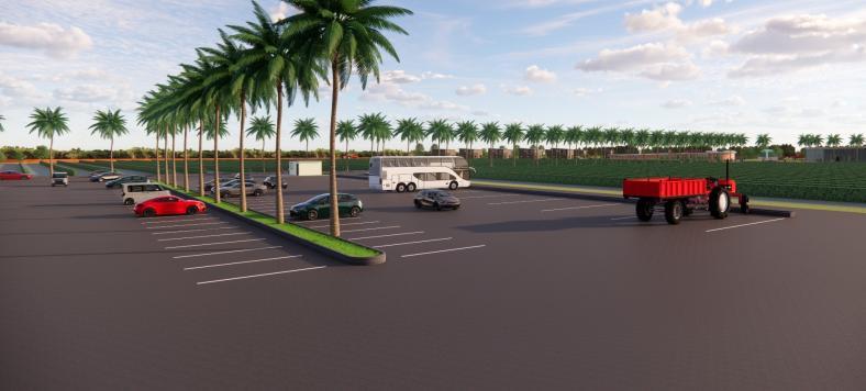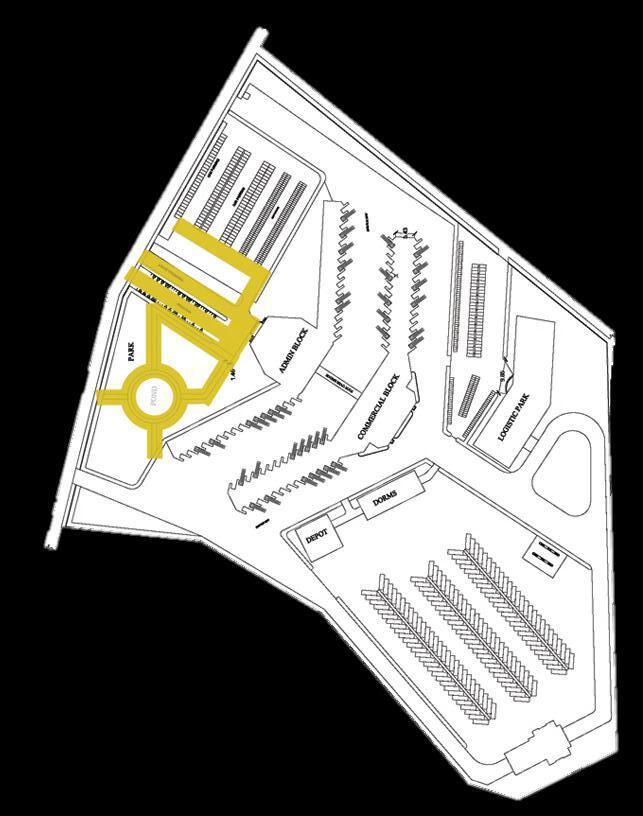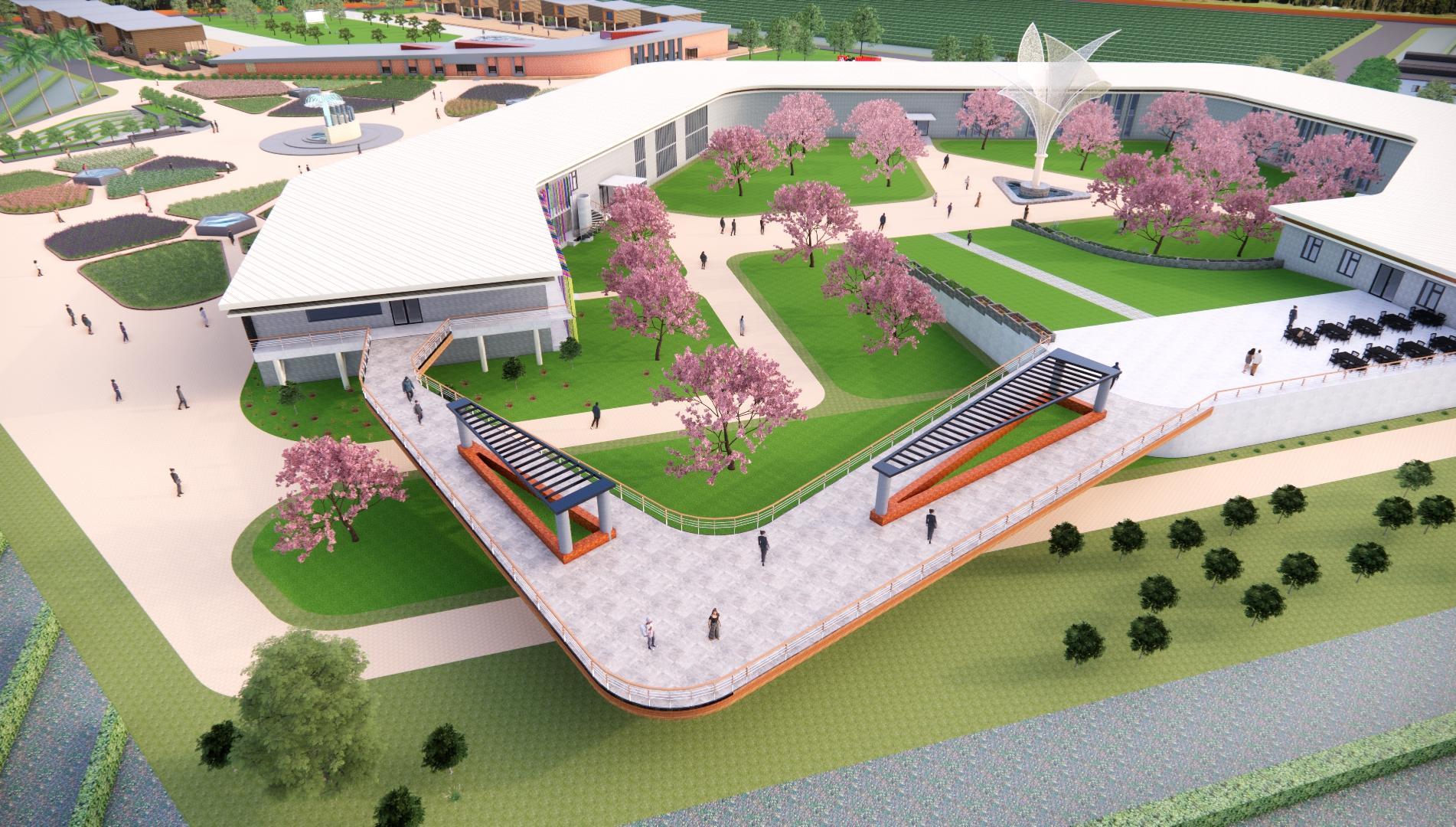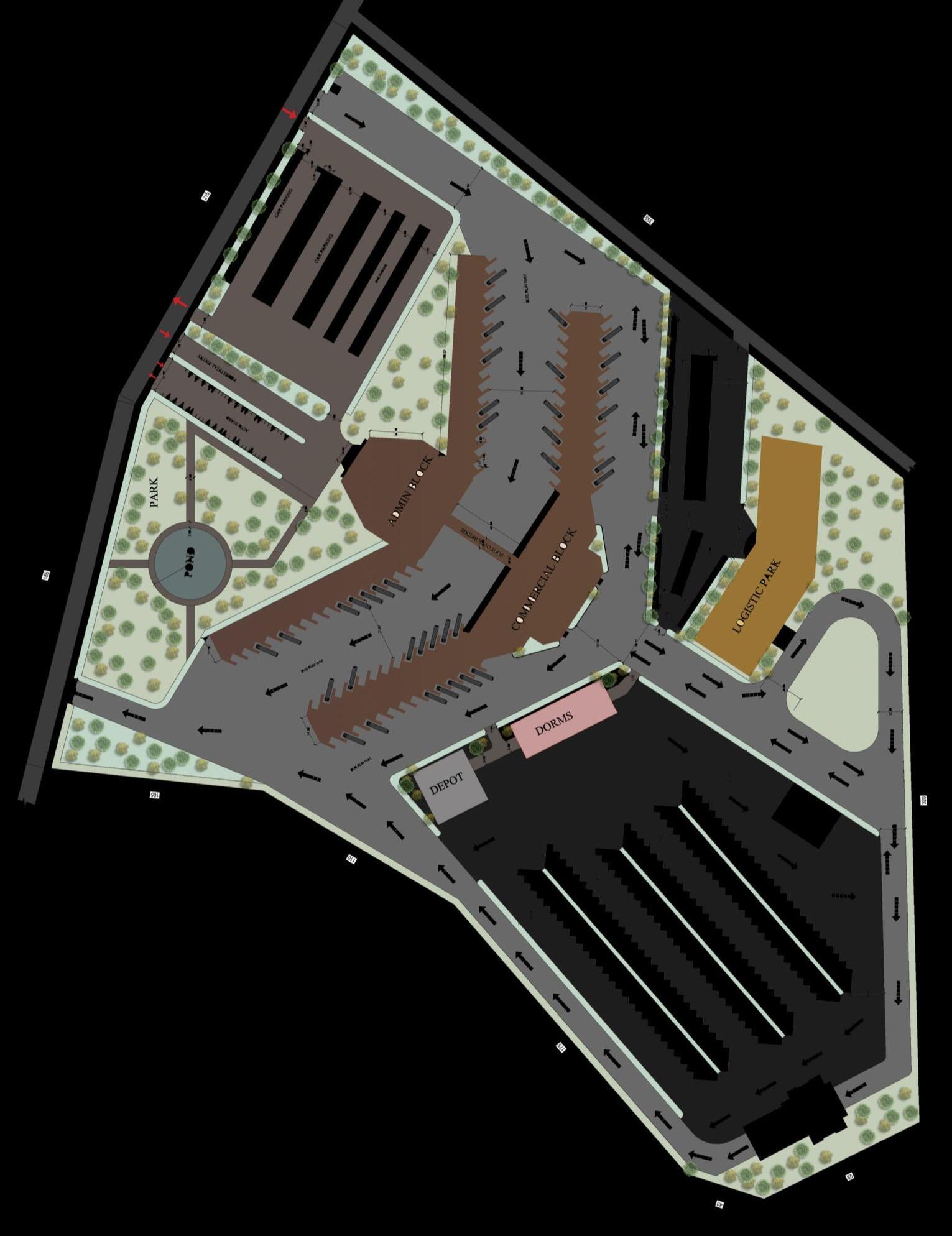 Separate pathways for buses and pedestrians ensure smooth and safe circulation.A park and water body at the entrance create a welcoming arrival experience while adding recreational space.