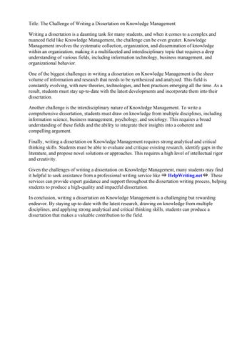 Given the challenges of writing a dissertation on Knowledge Management, many students may find it helpful to seek assistance from a professional writing service like ⇒ HelpWriting.net⇔. These services can provide expert guidance and support throughout the dissertation writing process, helping students to produce a high-quality and impactful dissertation.