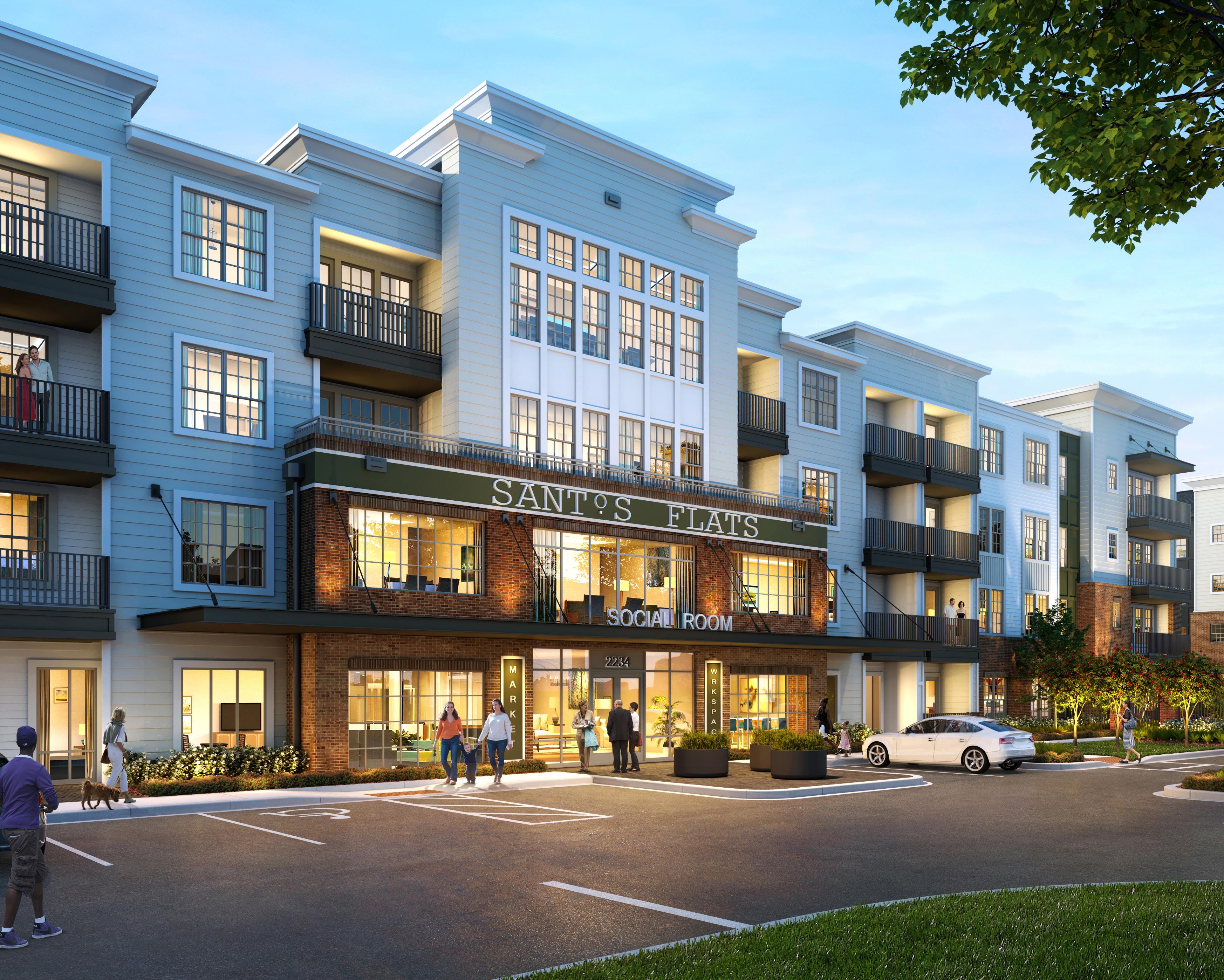 Cortland Santos Flats consists of two 4-story and five 2-story apartment buildings with 1-, 2-, and 3-bedroom apartment and townhome units, as well as an integrated clubhouse with leasing center. Parking is distributed as surface and tuck-under garages. The expansive amenities include a resort-style pool and sun deck, outdoor lounge with gas grills and cabanas, private work offices, 24/7 fitness center and yoga/spin studio, valet trash service, electric vehicle charging stations, package lockers, bark park, and dog grooming spa.