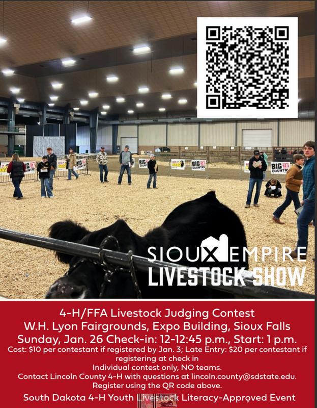 YouthcanalsoparticipateintheSiouxEmpireLivestockShow YouthLivestockJudgingContestinSiouxFallsonSunday,Jan.26. Check-inisfrom12-12:45p.m.andtheconteststartsat1p.m.Preregistrationis$10perpersonwithearlyregistrationduebyJan.3 athttps://web.siouxfallschamber.com/events/2025-Sioux-Empire-