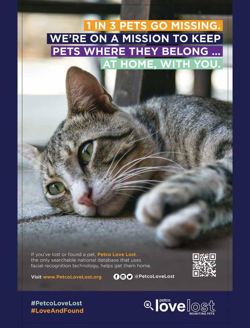• Flag your pet as missing on Petco Love Lost (lost.petcolove.org). It’s free to sign-up, so be sure to join immediately.