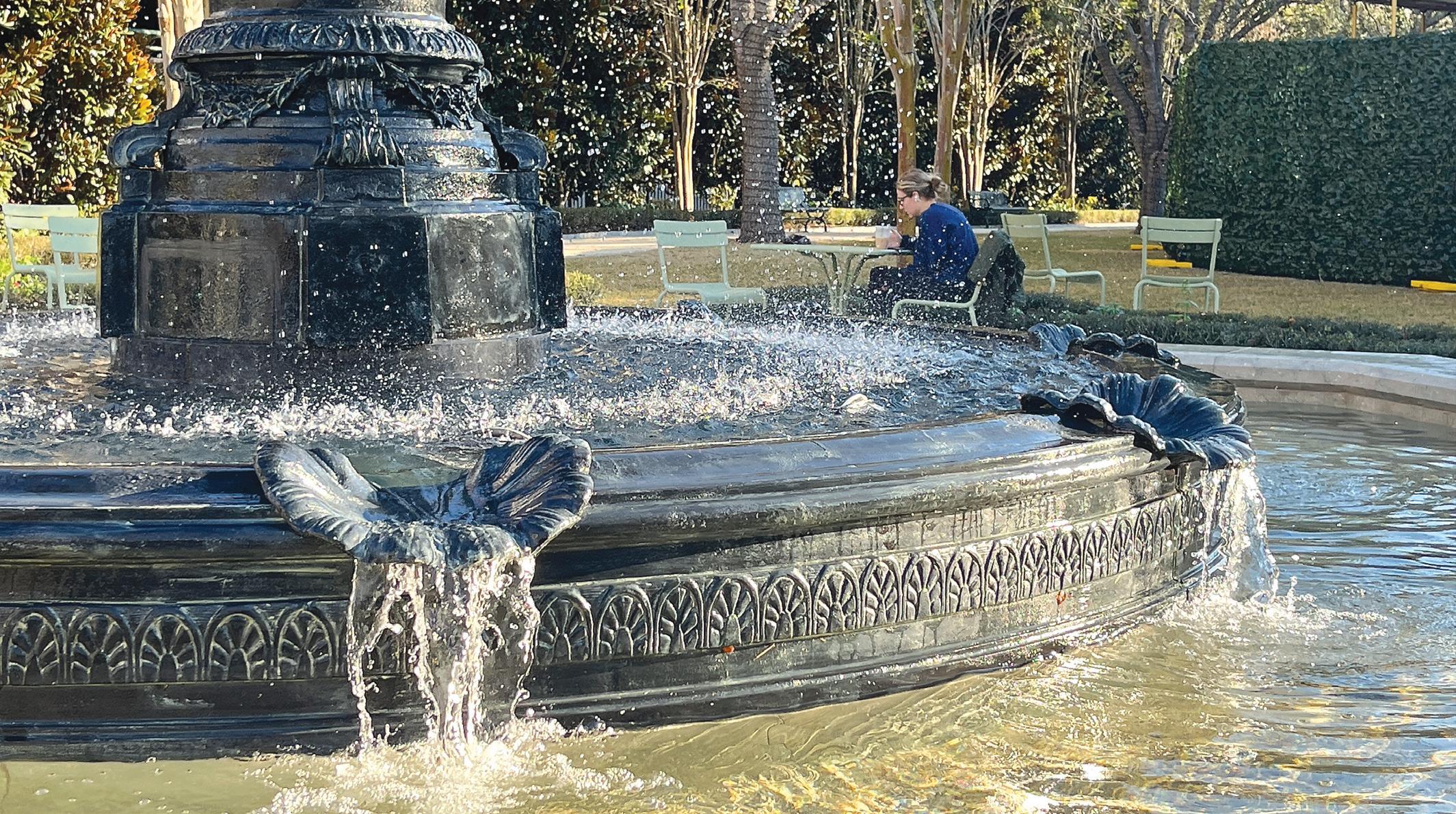 The gardens have a French-inspired feel with gravel-lined paths along an allee of 68 crepe myrtles, more than 100 magnolias and eight live oak trees. Two four-tiered foun-
