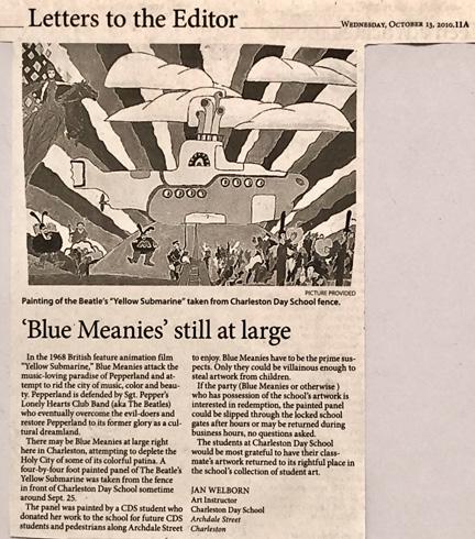 The Cerato/Galvin family has graciously donated the Yellow Submarine panel to Charleston Day, and the School plans to display the recovered art in the renovated Fielding property upon its completion. We are pleased to honor the history of the painting and the effect it had in our downtown neighborhood and celebrate Jan Welborn’s influence on the CDS art program.