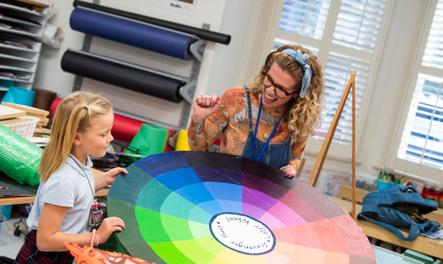 10. 3rd grader, Win, and Ms. Fallon get ready for a lesson about mixing colors.
