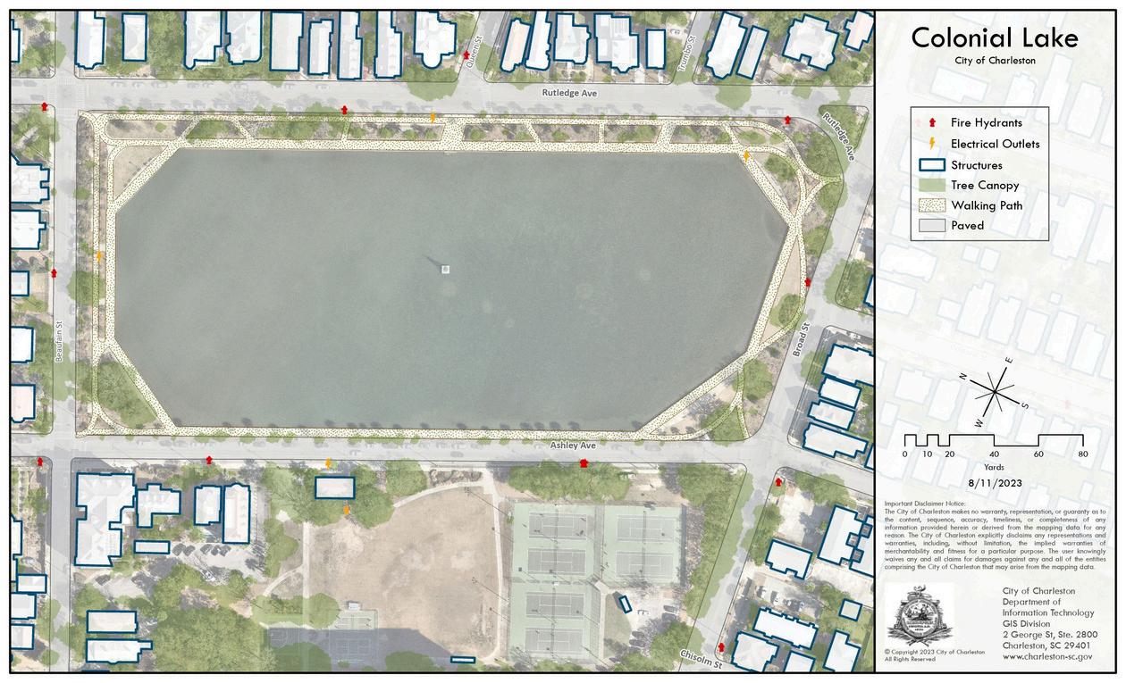 The Charleston Parks Conservancy closes down Ashley Road, and the part of the sidewalk through Colonial Lake that runs parallel to Ashley, for the event, and the entrance for Party for the Parks is at the corner of Rutledge and Ashley. We re-direct attendees from the vendor entrance and exit at the corner of Beaufain and Ashley around the lake, which is nearly 4 of a mile walk Etto golf carts would transport attendees to the main event entrance