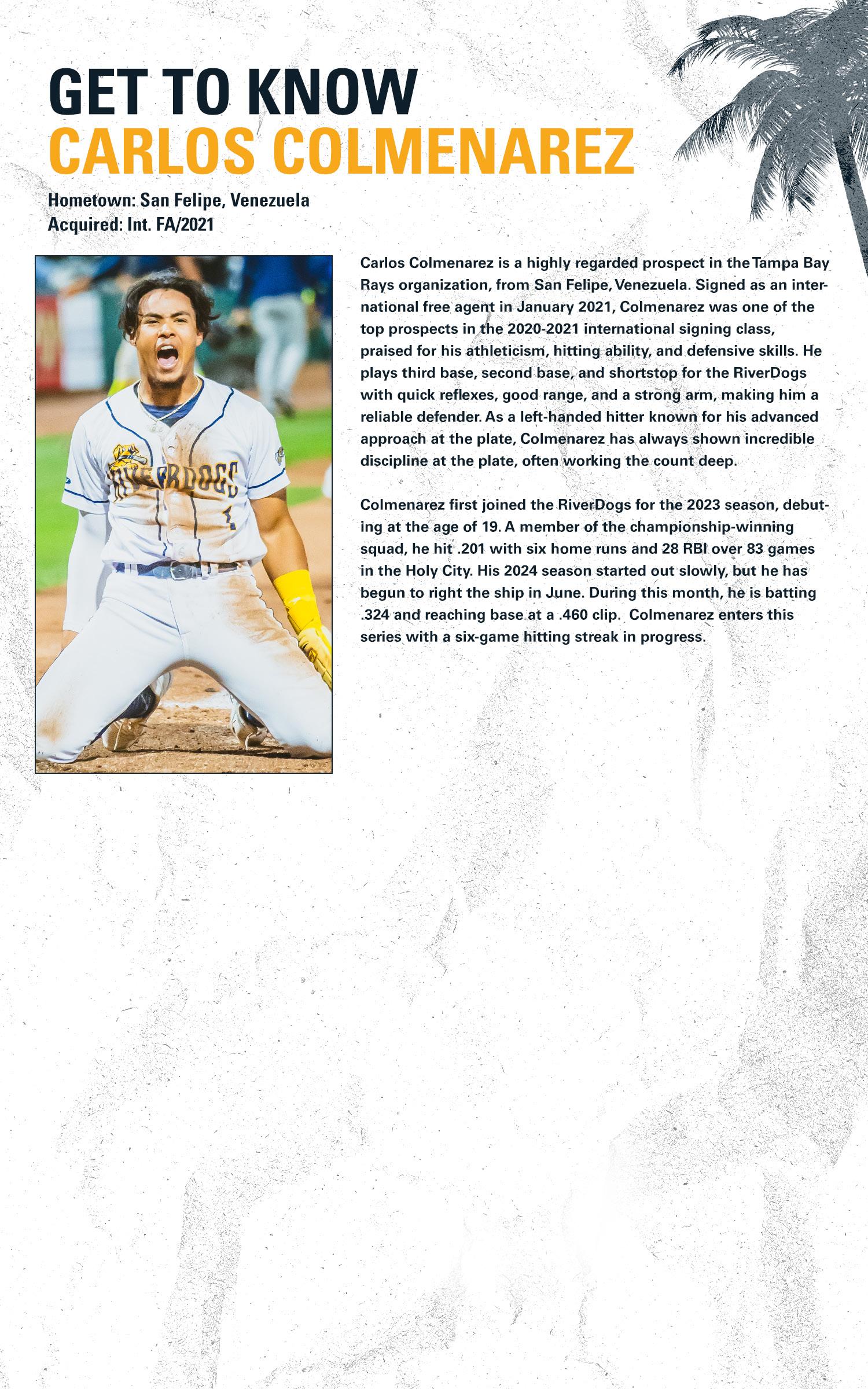 No. Pitchers (16) B T Ht Wt Birthplace Birthdate 2023 Club(s) College Acquired 26 Boucher, Adam R R 6'5 235 Metuchen, NJ 10/29/01 FCL Rays/Duke Duke 10th/2023 10 Chavez, Seth R R 6'4 200 Tucson, AZ 10/04/99 FCL Rays/Kentucky Kentucky UDFA/2023 31 De Jesus, Cesar L L 6'1 190 Santo Domingo, DR 09/28/03 FCL Rays None Int. FA/2021 18 De La Rosa, Manuel L L 6'0 155 Santo Domingo, DR 04/20/03 FCL Rays None Int. FA/2019 3 Dowd, Drew L L 6'2 206 Millbrae, CA 01/03/02 Stanford Stanford 8th/2023 11 Fowler, Dalton L L 6'6 200 Southaven, MS 01/07/00 FCL Rays/Memphis Memphis 9th/2023 20 Garcia, Engert R R 5'11 190 Santo Domingo, DR 04/30/00 DSL Rays None Int. FA/2023 16 Gill Hill, Gary R R 6'2 160 New Rochelle, NY 09/20/04 Charleston/FCL Rays None 6th/2022 17 Mejia, Samuel R R 6'0 192 Higuey, DR 06/17/02 Charleston/FCL Rays None Int. FA/2019 25 Murphy, Chandler L R 6'3 203 Glendale, AZ 12/18/00 FCL Rays/Missouri Missouri 12th/2023 32 Nichols, T.J. R R 6'5 189 Carmichael, CA 06/24/02 FCL Rays/Arizona Arizona 6th/2023 30 Rosario, Gerlin R R 6'3 211 Nagua, DR 02/15/02 Charleston/FCL Rays None Int. FA./2021 27 Rumbol, Jonalbert R R 5'9 170 Mariara, VEN 11/11/98 DNP None Int. FA/2023 28 Stevens, Will R R 6'3 230 Kansas City, MO 07/18/01 FCL Rays/ Tarleton State Tarleton State 15th/2023 29 Suarez, Santiago R R 6'2 175 Cumana, VEN 01/11/05 Charleston/FCL Rays None Trade/2022 35 Villaman, Chris L L 6'2 217 Greensboro, NC 03/16/01 DNP-Injury North Carolina State 9th/2022 No. Catchers (3) B T Ht Wt Birthplace Birthdate 2023 Club(s) College Acquired 19 Broecker, Bryan R R 6'2 200 Chicago, IL 01/26/02 Charleston/FCL Rays Michigan State 13th/2023 12 Delgado, Enderson S R 5'11 184 Cabimas, VEN 09/21/04 Charleston/FCL Rays None Int. FA/2022 13 Martinez, Raudelis L R 6'0 180 Santa Clara, Cuba 05/30/02 Charleston/FCL Rays None Int. FA/2020 No. Infielders (6) B T Ht Wt Birthplace Birthdate 2023 Club(s) College Acquired 37 Barreat, Elis R R 5'9 158 La Victoria, VEN 05/22/03 Montgomery/FCL Rays None Int. FA/2019 1 Colmenarez, Carlos L R 5'10 188 San Felipe, VEN 11/15/03 Charleston None Int. FA/2021 9 Gonzalez, Ricardo S R 6'0 186 El Tigre, VEN 07/06/04 FCL Rays None Int. FA/2022 6 Polanco, Narciso L R 5'11 161 Sanchez, DR 10/28/04 FCL Rays None Int. FA/2022 8 Santana, Adrian S R 5'11 155 Hialeah, FL 07/18/05 FCL Rays None CB-A/2023 33 Shin, Wooyeoul R R 6'0 220 Seoul, Republic of Korea 12/30/01 FCL Rays Miami Dade CC 16th/2023 No. Outfielders (4) B T Ht Wt Birthplace Birthdate 2023 Club(s) College Acquired 21 Diaz, Jhon L L 5'8 160 Santo Domingo, DR 10/01/02 Charleston None Int. FA/2019 34 Mateo, Angel R R 6'2 190 San Juan De La Maguana, DR 02/13/05 Charleston/FCL Rays None Int. FA/2022 5 Paulino, Enzo L R 5'11 179 Santo Domingo, DR 05/25/04 FCL Rays None Int. FA/2021 7 Peguero, Odalys S R 5'9 172 San Pedro de Macoris, DR 01/25/03 Charleston/FCL Rays None Int. FA/2019 No. Injured List (5) B T Ht Wt Birthplace Birthdate 2023 Club(s) College Acquired Ayala Jr., Alex R L 6'1 204 Chiriqui, Panama 11/26/01 Charleston/Bowling Green Florida Southwestern State 9th/2021 4 Myers, Noah L R 6'1 190 Windsor, Ontario, Canada 11/11/99 Evansville (Frontier League) South Carolina-Upstate FA/2024 Robertson, Blake L R 6'5 200 San Antonio, TX 05/19/01 Bowling Green Oklahoma 7th/2022 Snelsire, Hayden R R 6'3 205 Monroeville, PA 01/16/01 FCL Rays/Randolph-Macon Randolph-Macon 17th/2023 15 Stevenson, Owen R R 6'4 205 San Francisco, CA 09/01/02 FCL Rays/ArizonaState Arizona State 19th/2023
