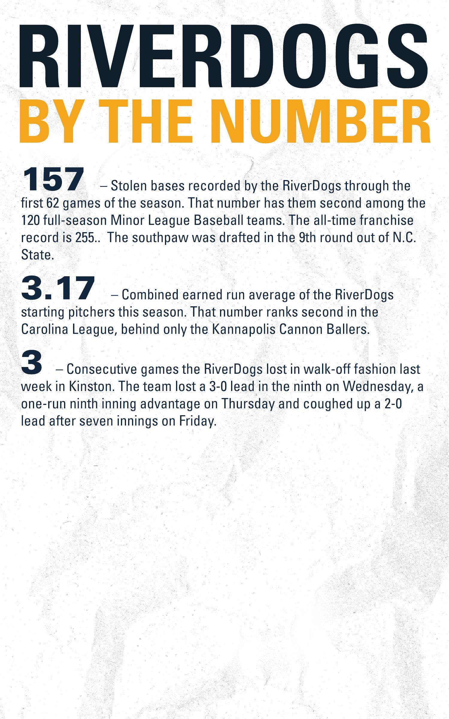 Single- A Affiliate of the Tampa Bay Rays 22 • Sean Smedley - Manager 23 • Levi Romero - Pitching Coach 24 • Brett Schneider - Hitting Coach 2 • Ronnie Richardson - Bench Coach Halee Williams - Athletic Trainer Gio Caraballo - Strength and Conditioning Coach John Horaz - Clubhouse Manager Nick Chico - Assistant Clubhouse Manager Charleston RiverDogs 360 Fishburne St. • Charleston, SC 29403 Phone: • Fax: Email: admin@riverdogs.com