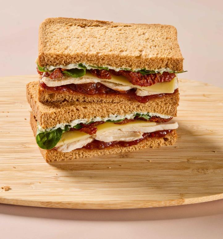 Mozzarella, roasted sun-dried tomatoes and rocket with tomato relish and basil mayonnaise on malted bread.