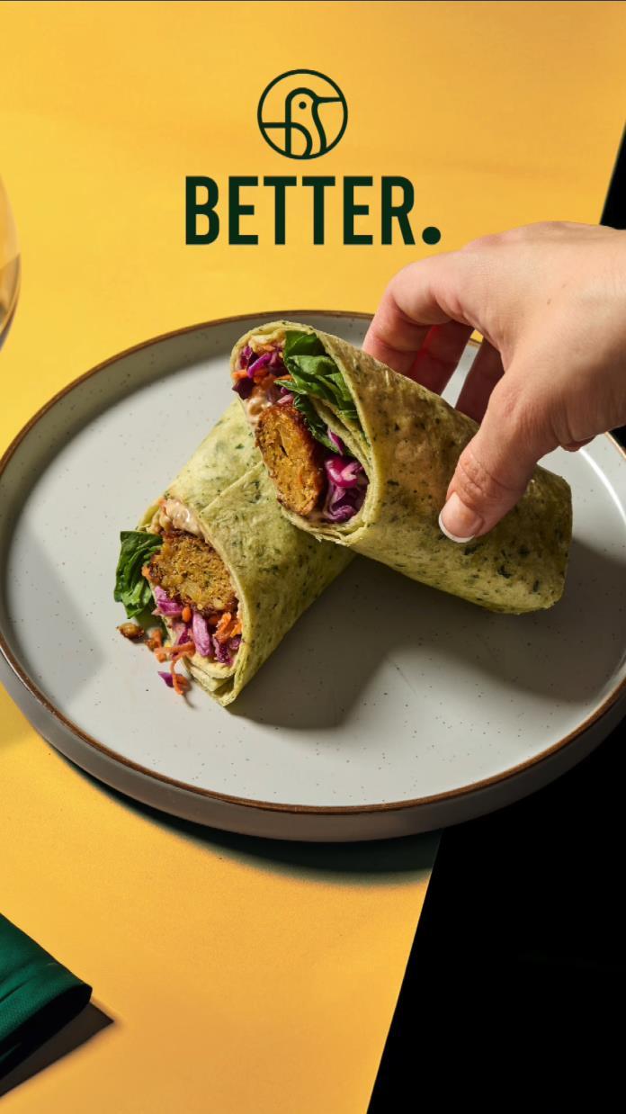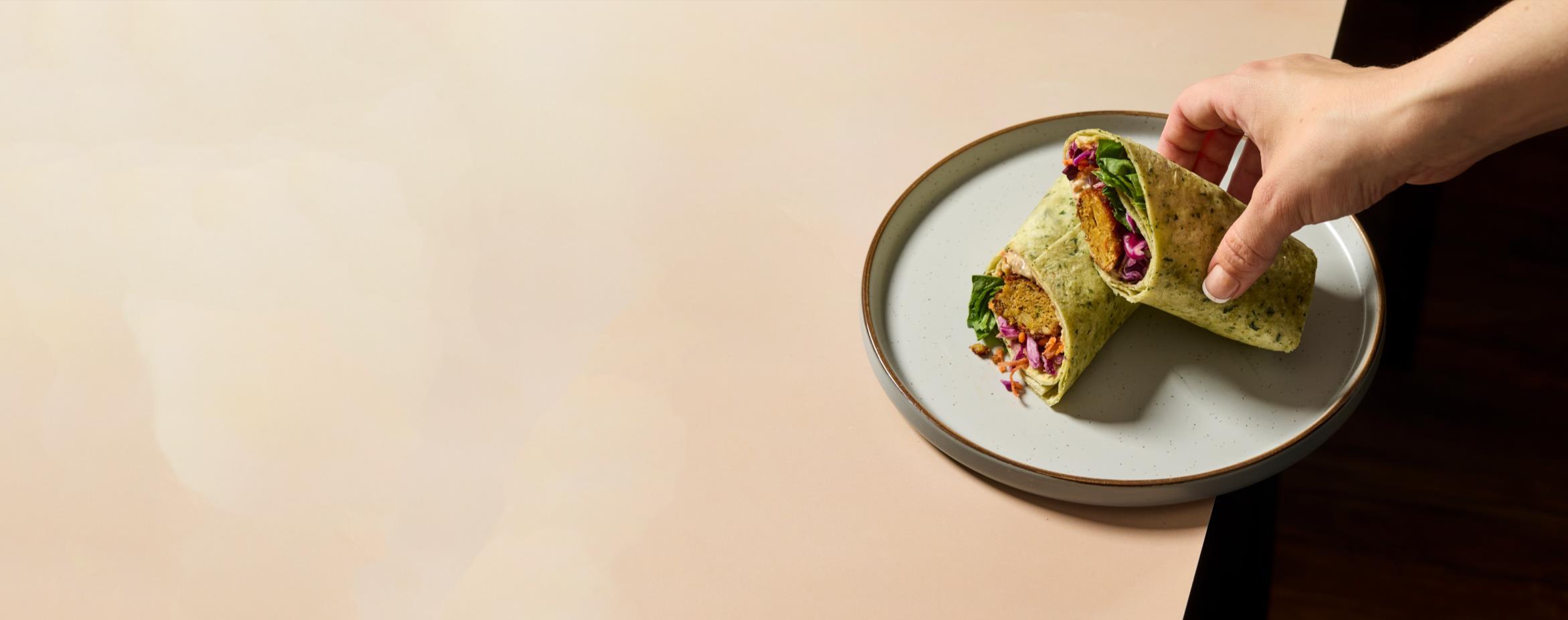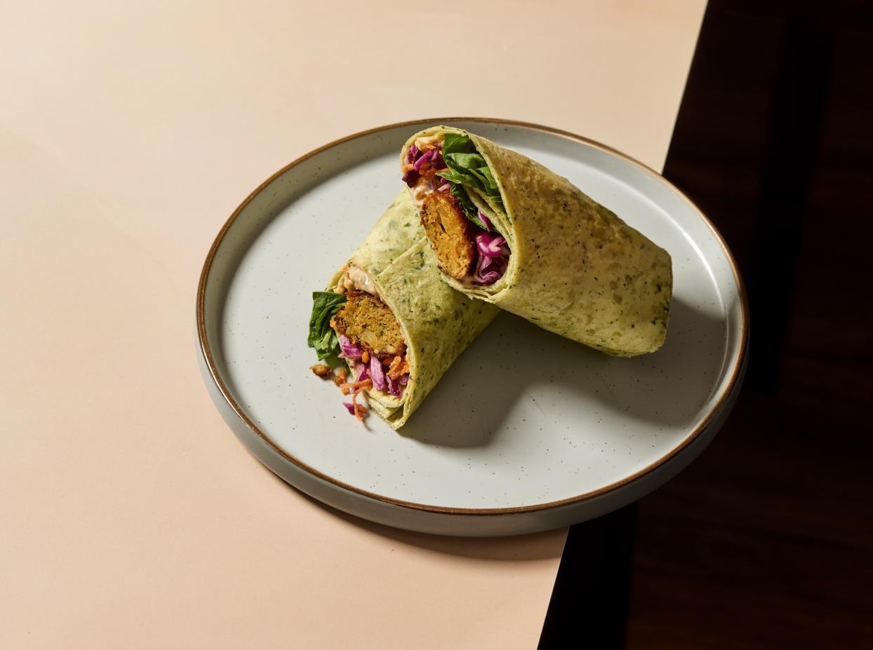 Sweet potato falafel, pickled slaw and Houmous with a caramelised onion vegan mayonnaise and spinach in a spinach Tortilla.