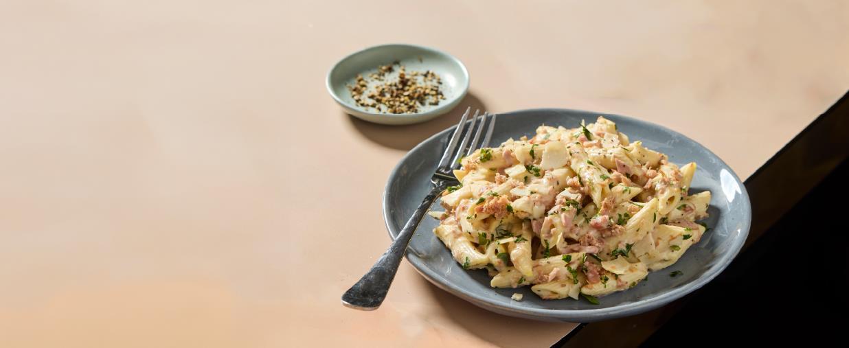 • An Italian Inspired classic, our carbonara is our latest edition to our new hot range. Creamy and herby with a salty tang from our pulled ham hock.