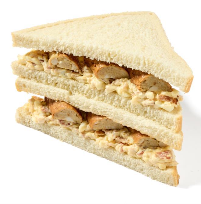 Pork and onion sausage, free-range egg & bacon mayonnaise on white bread.