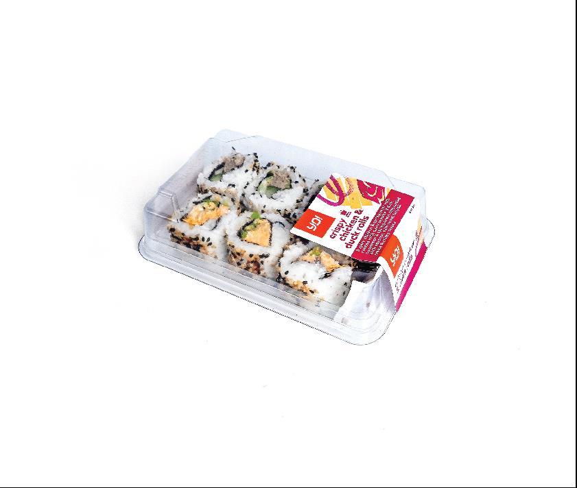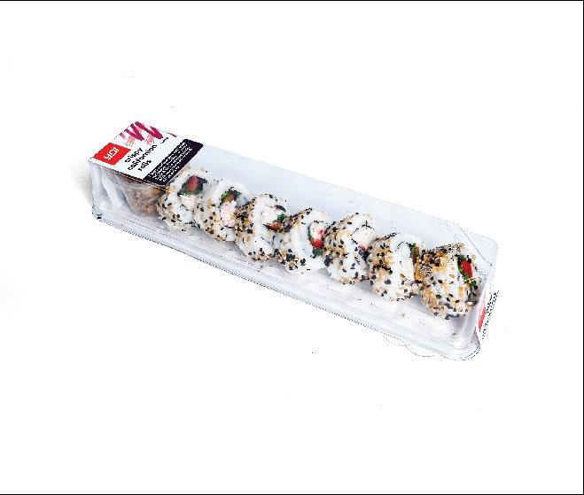 7 MSC seafood stick rolls with red pepper & rocket, coated in black & white sesame seeds, with sweet teriyaki sauce & crispy onions.