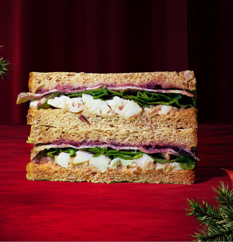 Pulled turkey, smoked streaky bacon, gravy stu ng mayonnaise, cranberry sauce and spinach on malted bread.