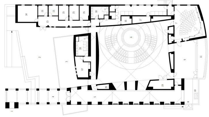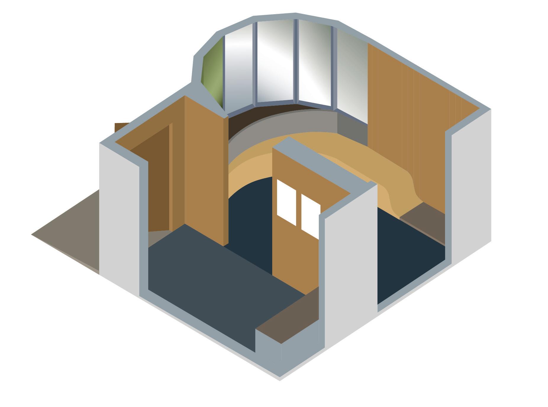 Luonnon valon puute ratkaisutettiin takavalaistetuilla lasipaneeleilla. Tila on tarkoitettu erilaisille ryhmätapahtumille. Tämän takia siellä on korostettu juostavuus: salissa ei ole kiinteitä kalusteita, mikä mahdollista monta eri vaihtoehtoja tilan käyttöön.