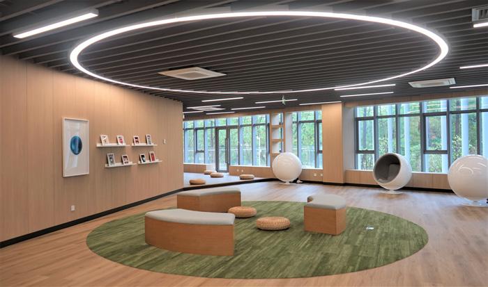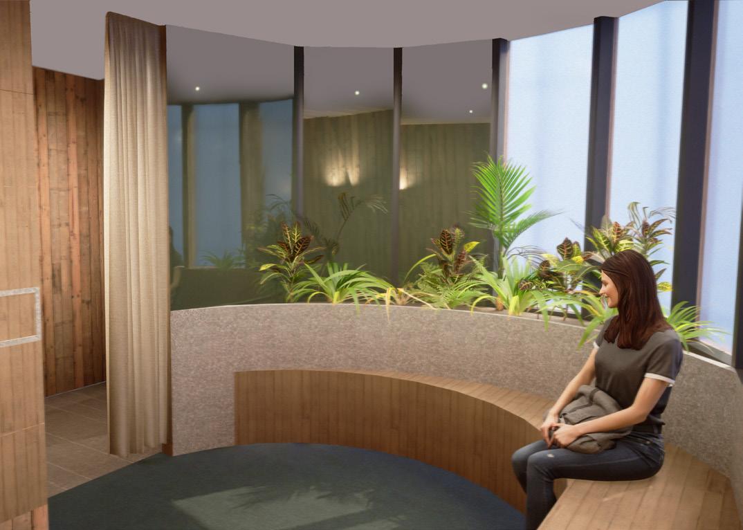 Tilassa on isot ikkunat, joista näkyy metsäinen ympäristö. Näkymiä luontoon, sekä luonnonvalo ikkunoista luovat rauhoittavan ilmapiirin. Auringonvalon lisäksi tila valoisettaan LEDvalaistuksilla, joiden lämpötila on lähellä luonnonvaloa. Tilassa on käytetty paljon puuta. Huoneessa suurilla osalla kalusteista on pehmeät muodot, jotka lisäävät tilaan kutsuvuutta.
