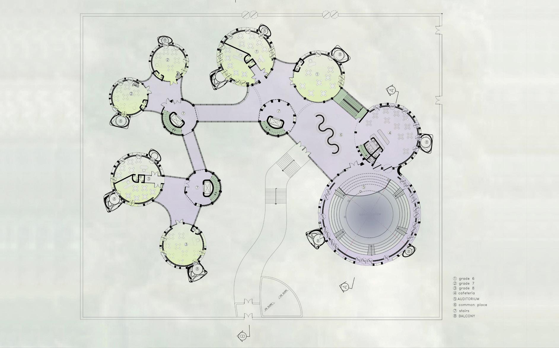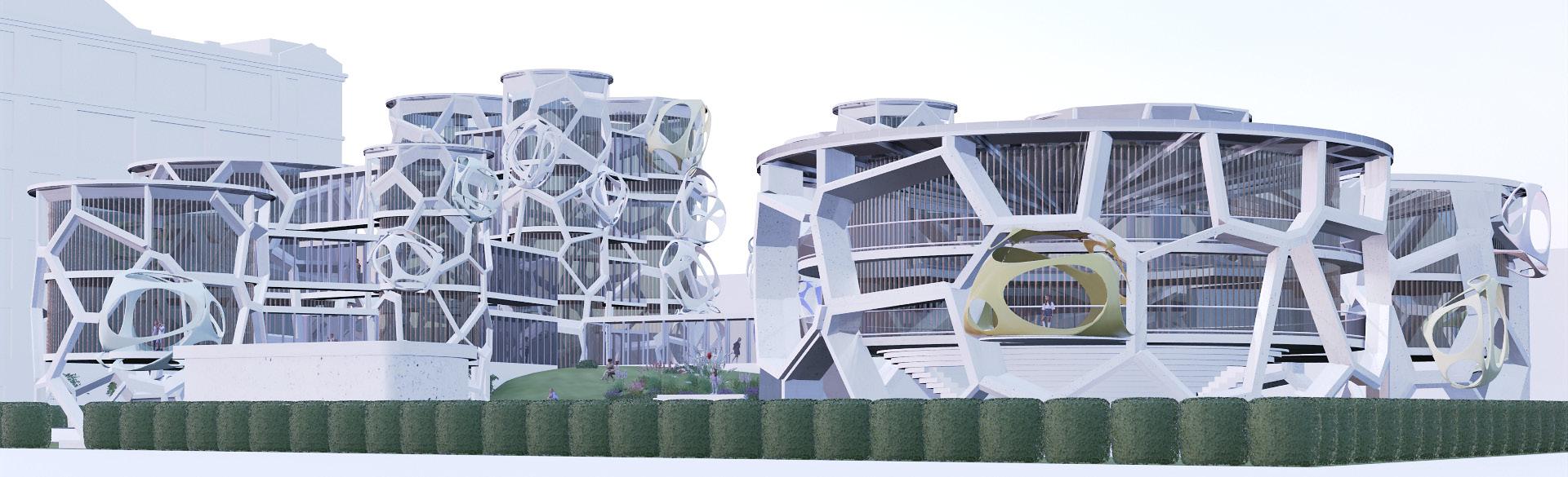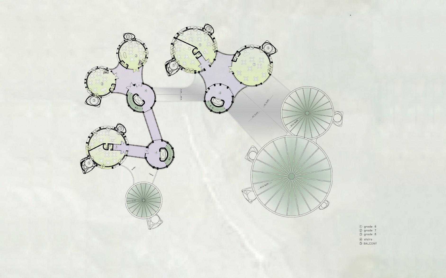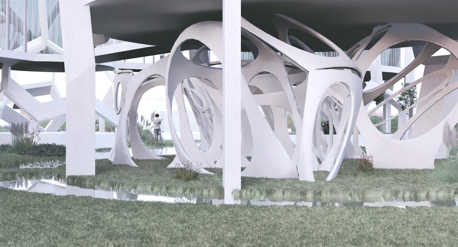The Water Lily middle school project in Red Hood Brooklyn aims to create a learning environment that incorporates nature, fostering love and enjoyment of the natural world for children. The project draws inspiration from the Mexican water lily and bird bone structure, which inform the roof and facade structures respectively. The 11-building project is designed with each grade having three buildings featuring three classrooms and a staircase on each floor, providing independent space and green gardens for each classroom. Elevated 12 feet from the ground, the project is protected from potential flooding, while the underneath space is utilized to grow plants, blending the building into its natural surroundings. The project also includes a retaining water area for the building's market part, which is open to the public. Precast concrete with holes is used for the facade structure, allowing plants to grow on top, creating a lively green building. Overall, the Water Lily middle school project is a unique and innovative design that combines nature and education to create a harmonious and engaging learning environment for children.