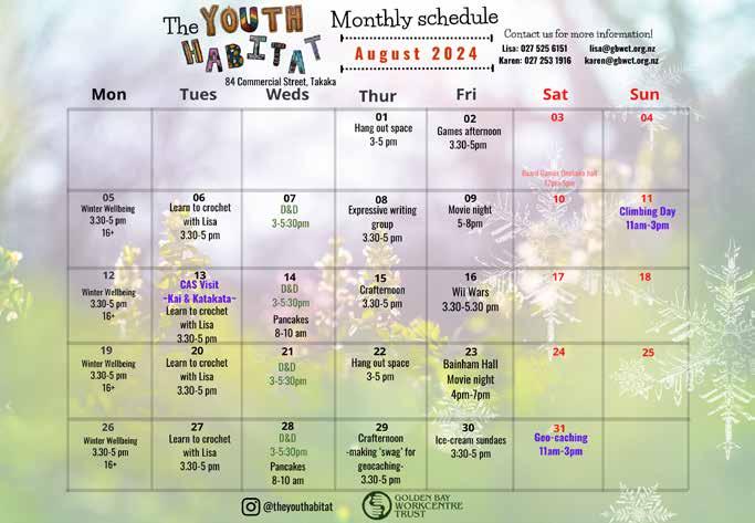 WELLBY TALKING CAFÉ: 1.30pm-3pm, Wholemeal Café, Tākaka. Wellby Talking Cafés are about social connection and finding out about groups, activities and services. www.wellby. org.nz, ph 03 546 7681.