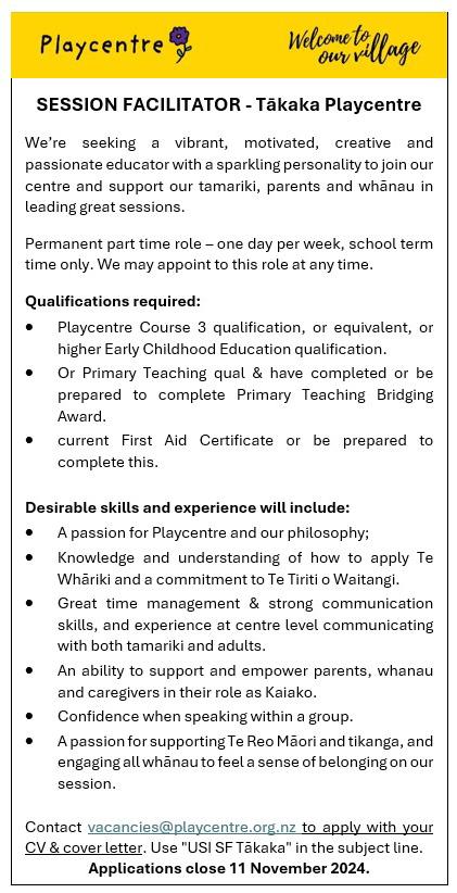 O NEKAKA PLAYGROUP, all welcome, Wednesdays 10am12.30pm, Onekaka Hall.