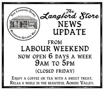 KIDZTHEATRE PRESENT “Pegora the Witch”, Saturday 2 November, 4pm at The Playhouse, Tākaka. Tickets: adults, $10; children, $5 (cash required) at Paper Plus. Dress theme Halloween! UPCOMING EVENTS /