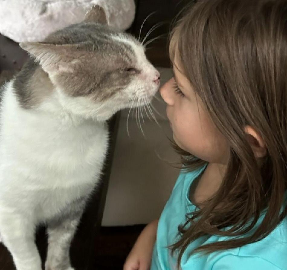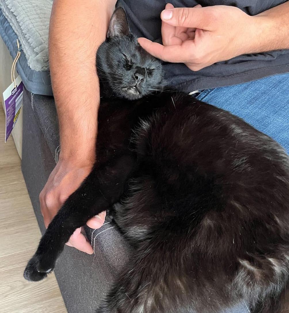 Eddie’s patience finally paid off at the end of 2023 when his perfect family walked through the shelter doors. Nowadays, Eddie passes the time making biscuits and snuggling on his adopters’ laps before undertaking his daily zoomies. His family says he is the sweetest cat they’ve ever