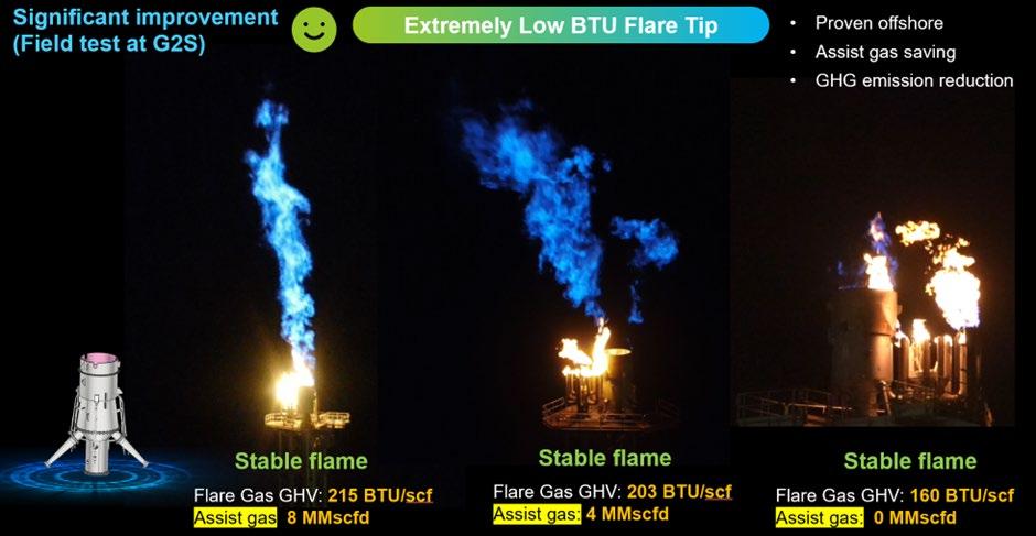 combustion conditions at the flare tip are achieved, flare performance is consistent, and combustion is steady even at very low BTU levels and under adverse offshore conditions. This leads to a 40% improvement in combustion efficiency compared to conventional counterparts, whilst reducing greenhouse gas emissions through the reduction of assist gas.