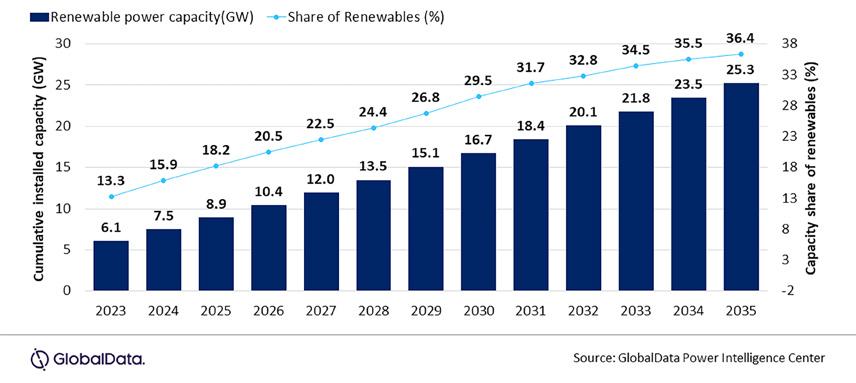 Renewable capacity in Malaysia is seen to continue to grow from 6.1 gigawatts (GW) in 2023 to 25.3 GW in 2035. Based on the latest growth trend, the country is expected to achieve 18.2% renewable capacity by 2025 and 36.4% by 2035, GlobalData said.