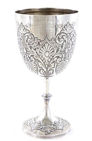 Sheffield, dated 1896, heavily chased design, with presentation engravings: Diamond Jubilee, Market Weighton Show, July 5th, 1897, T. Bell, Hon: Sec: Presented by The Right Honble Earl of Londesbowough