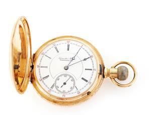 Pocket Watch, Schmedtie Bros. circa 1883, enameled dial and works with , marked: Schmedtie Bros., Washington DC, and serial number 1258724; contained in ornate 14K gold case stamped: 14K, A.W.C.CO, 514404, and engraved: Marie to Will, 1896; H2 3/4" W1 7/8", and 113.5g all in