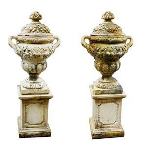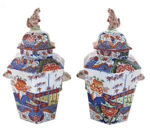Pair English Ironstone Covered Urns late 19th century, decorated in the oriental tastes, unmarked; H17"