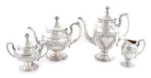 acanthus and floral design, comprising: coffeepot, H11" teapot, H9" covered sugar, L7" creamer, H5 1/2" each stamped: 925, Made in Spain; and Total 68.5ozT (4pcs)