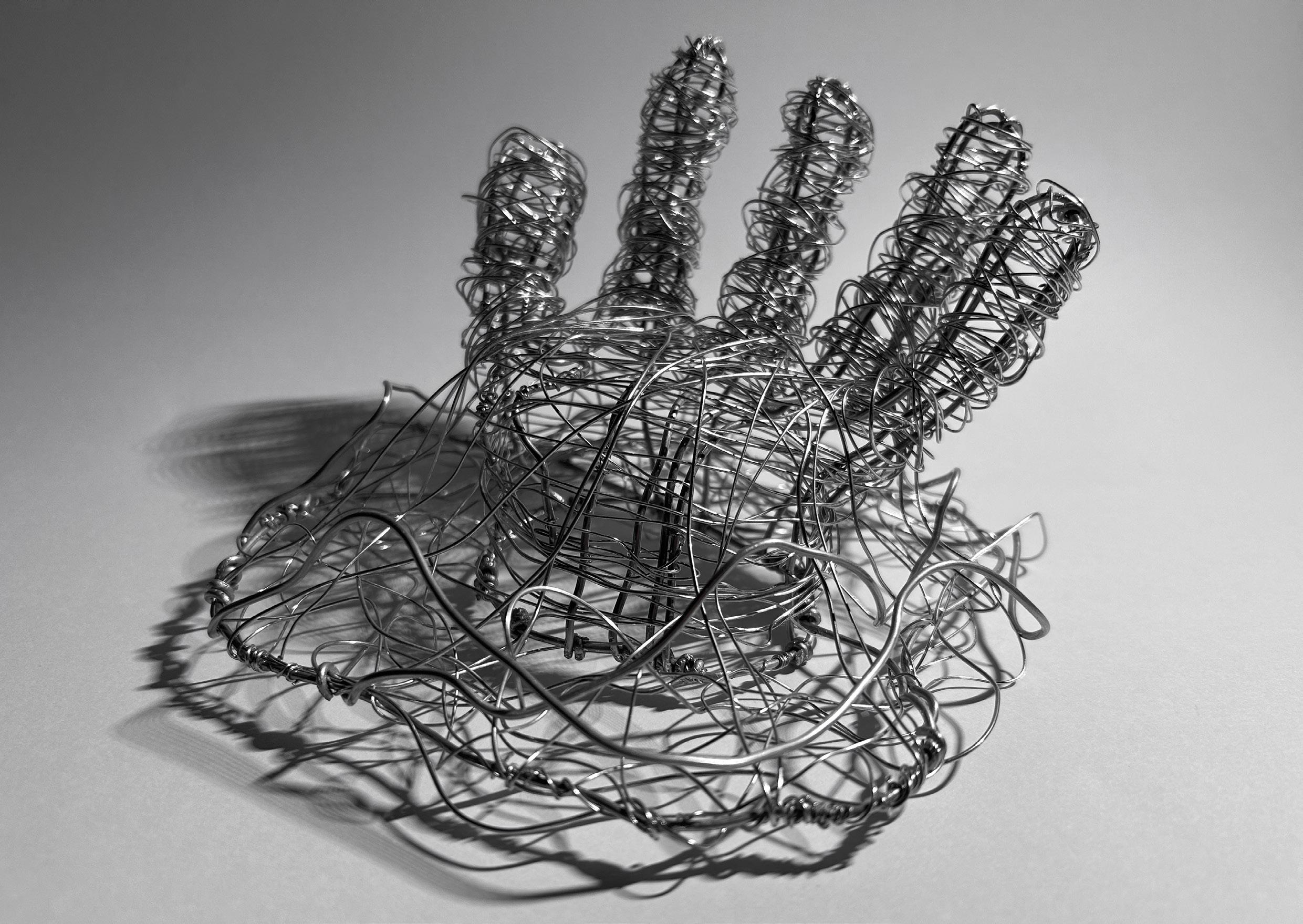 Whilst experimenting with different wire joinery techniques and wire thicknesses, I was able to utilise florist wire to create a final three-dimensional form from the chosen image. ‘Manus,’ latin for ‘hand’ is inspired by the principle of direction in which the hand itself appears as if it is emerging from a pool and directing itself upwards, escaping from the abyss.