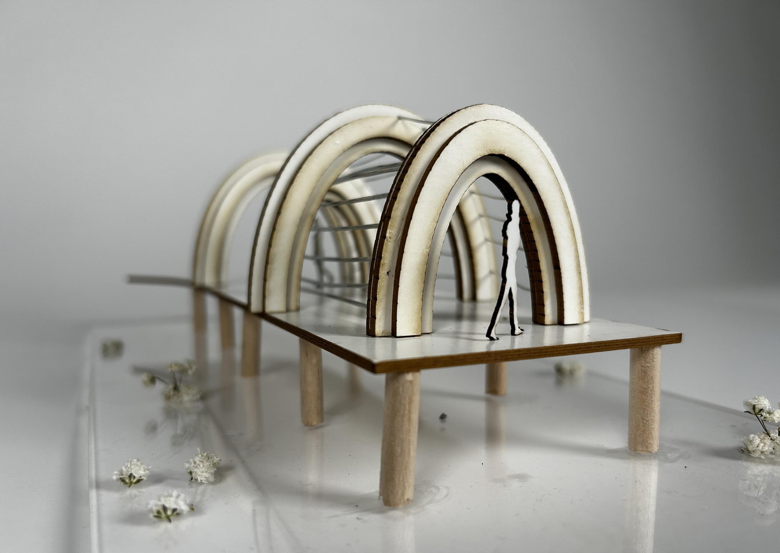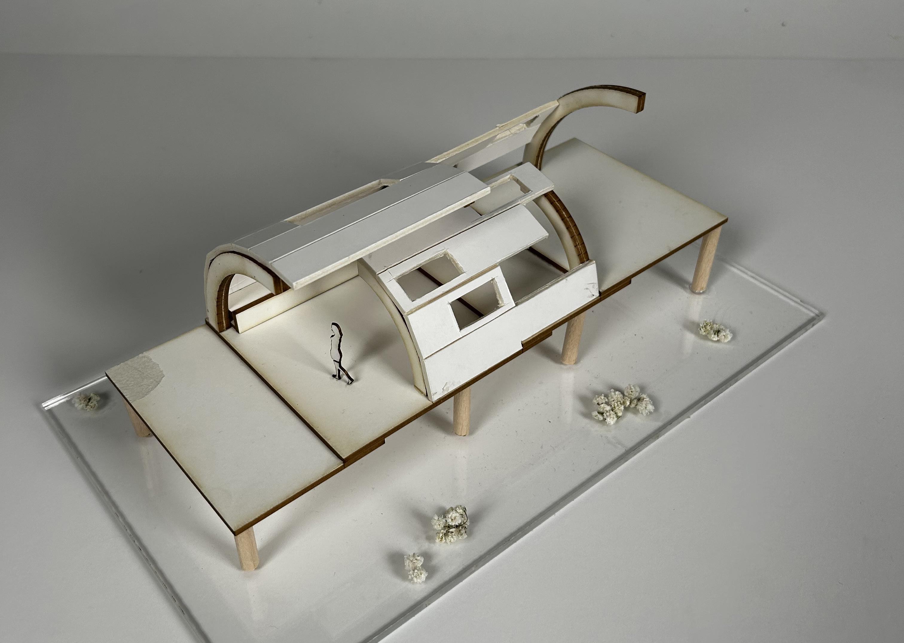Station 2 focuses on movement and direction whereby the incomplete arches give the illusion of jumping from one end of the arch to another. This is accentuated via the use of the horizontal rectangular windows in the roofing structure that prompts the user to move forward. The wooden bench acts as a resting place that allows the user to absorb its surroundings which can be likened to the lingering effects of angelic vocals and violins in the music piece that invites the listener to absorb and admire its presence.