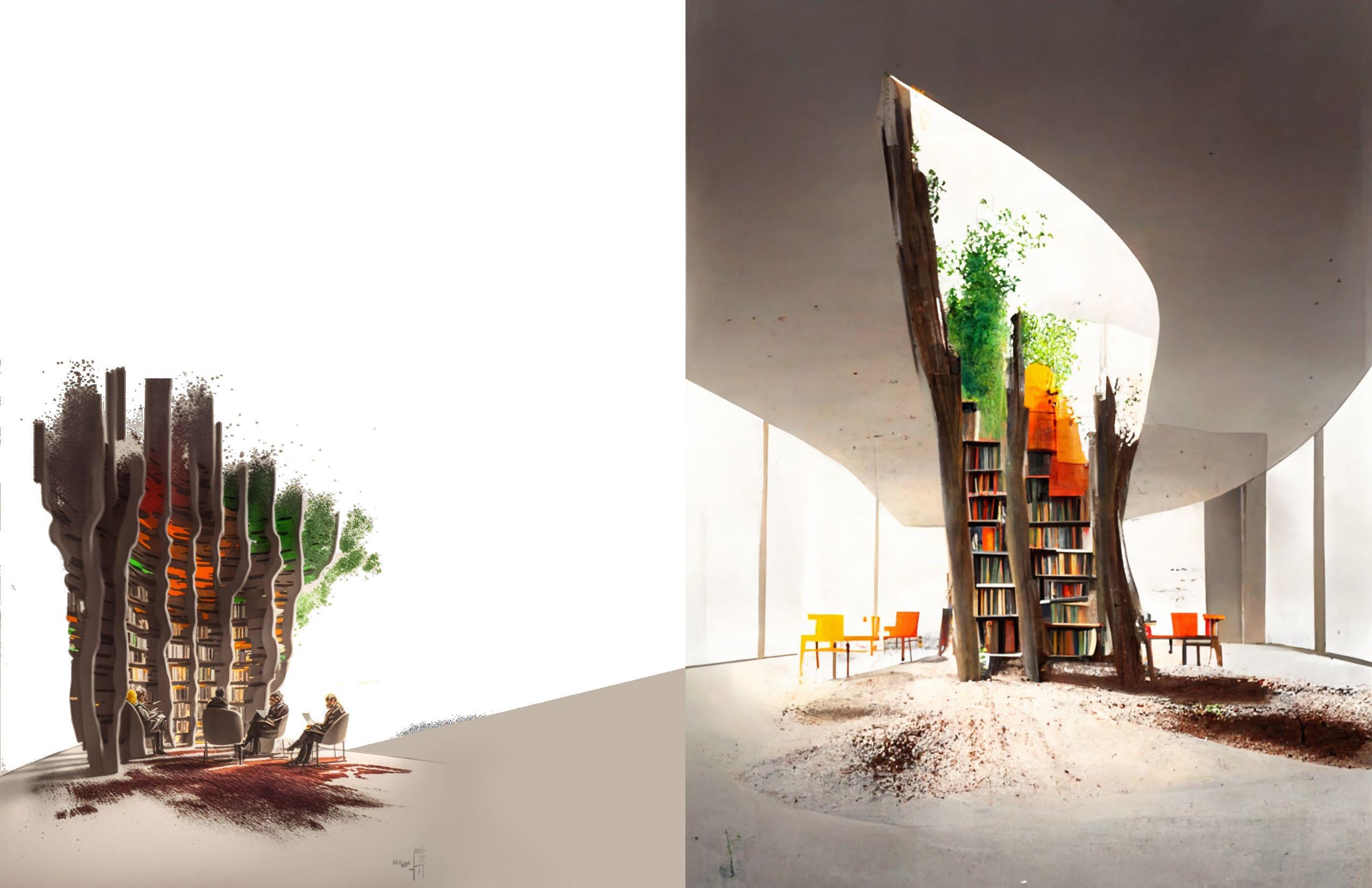 A contemporary modern architecture library with chairs made up of tree bark and people reading books