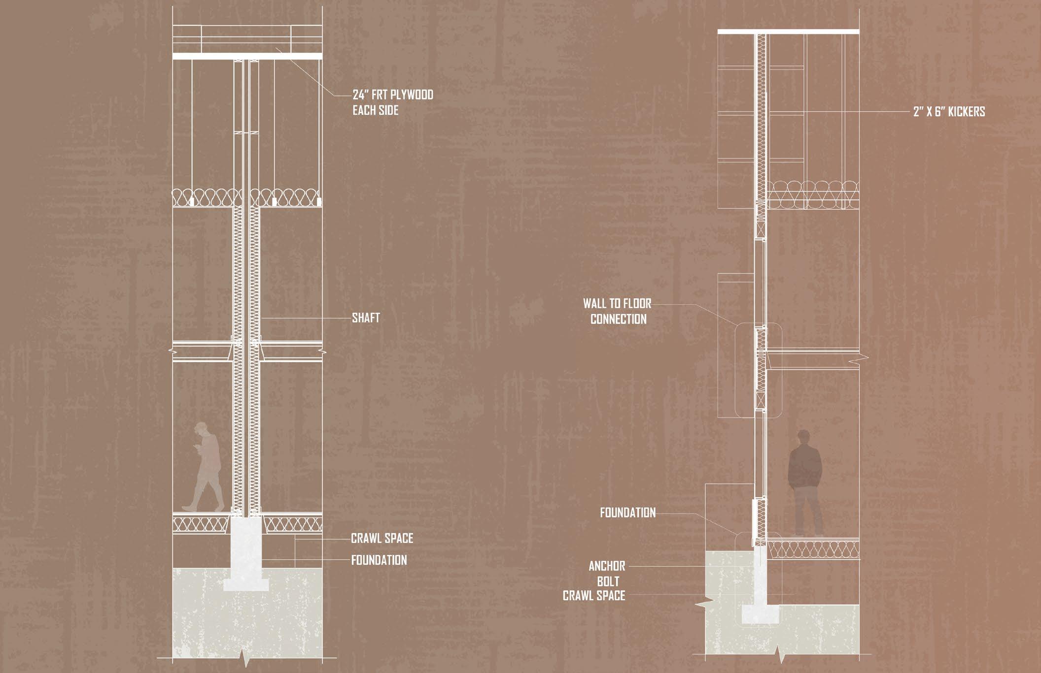 Wall Section Detail: Revit BOTTOM OF TRUSS 2X6” RAFTER TRAIL 2” VENT AT STRUCTURAL BAY ASPHALT SHINGLES Scale Date Drawn By Checked By Project Number 1/2" = 1'-0" 04/19/2021 EAST WALL SECTION T39N, R5W (LOT #2 & 3 CITY OF MOSCOW R-4 Twin Houses Checker Gregory 04/19/2021 Project Number A121 Basement -8' - 11 1/4" A126 2" X 6" KICKERS HANGER WOOD TRUSS JOINT 3/4" P.W. 1/2" GYP. TRIM N.T.S FLASHING SIDING TRIM ANCHOR BOLT FINISHED FLR. 1/2" P.W. FLASHING 3 EAST WALL SECTION DETAIL 3" = 1' 0" 3 A121 #5 G60 @ 23" O,C. or per Table 404.1.2 (8) R-30 ARCH 454 DESIGN BUILD 2X6” TOP PLATE WINDOW HEADER 4X12” BEAM DIAMOND KOTE