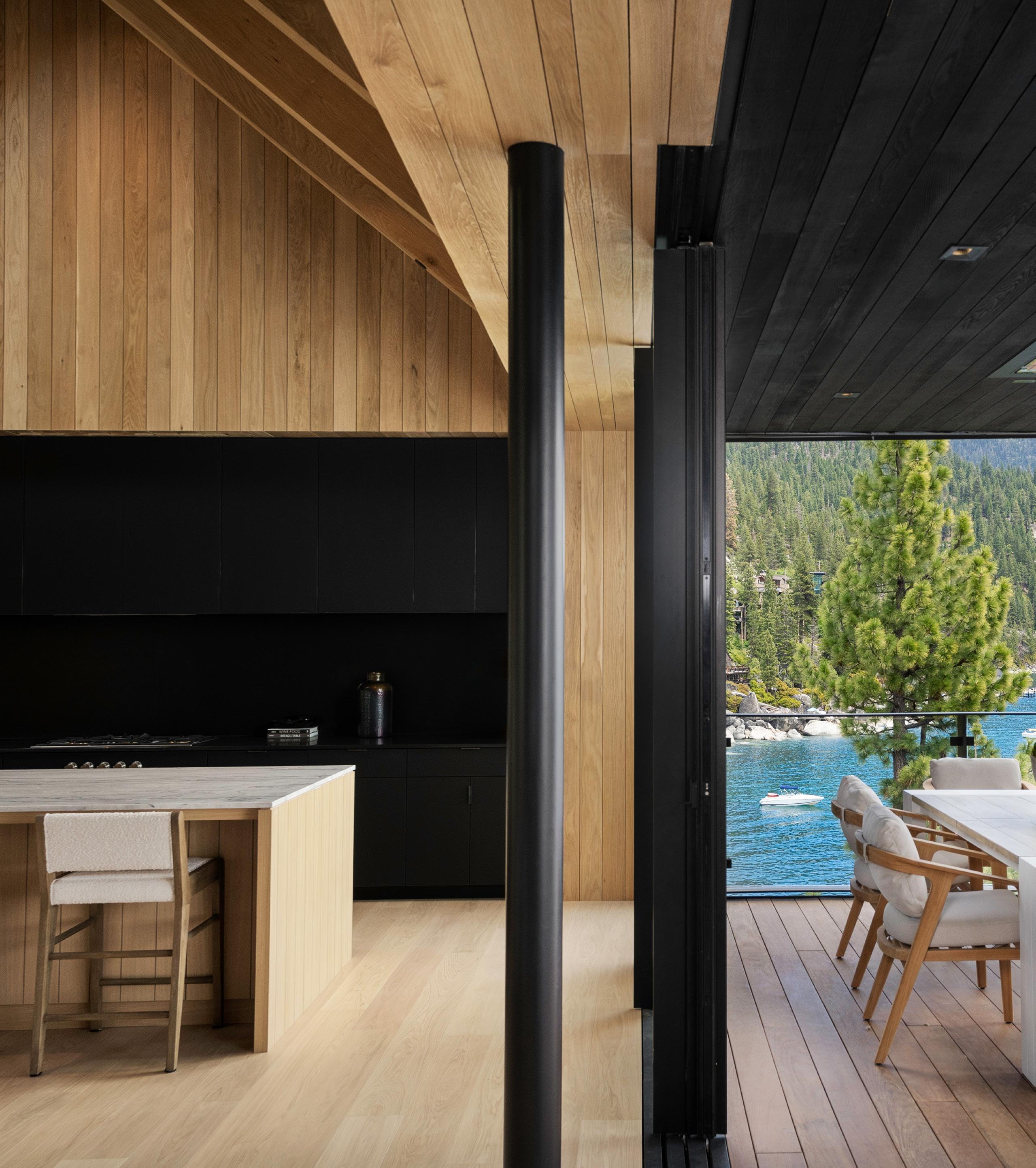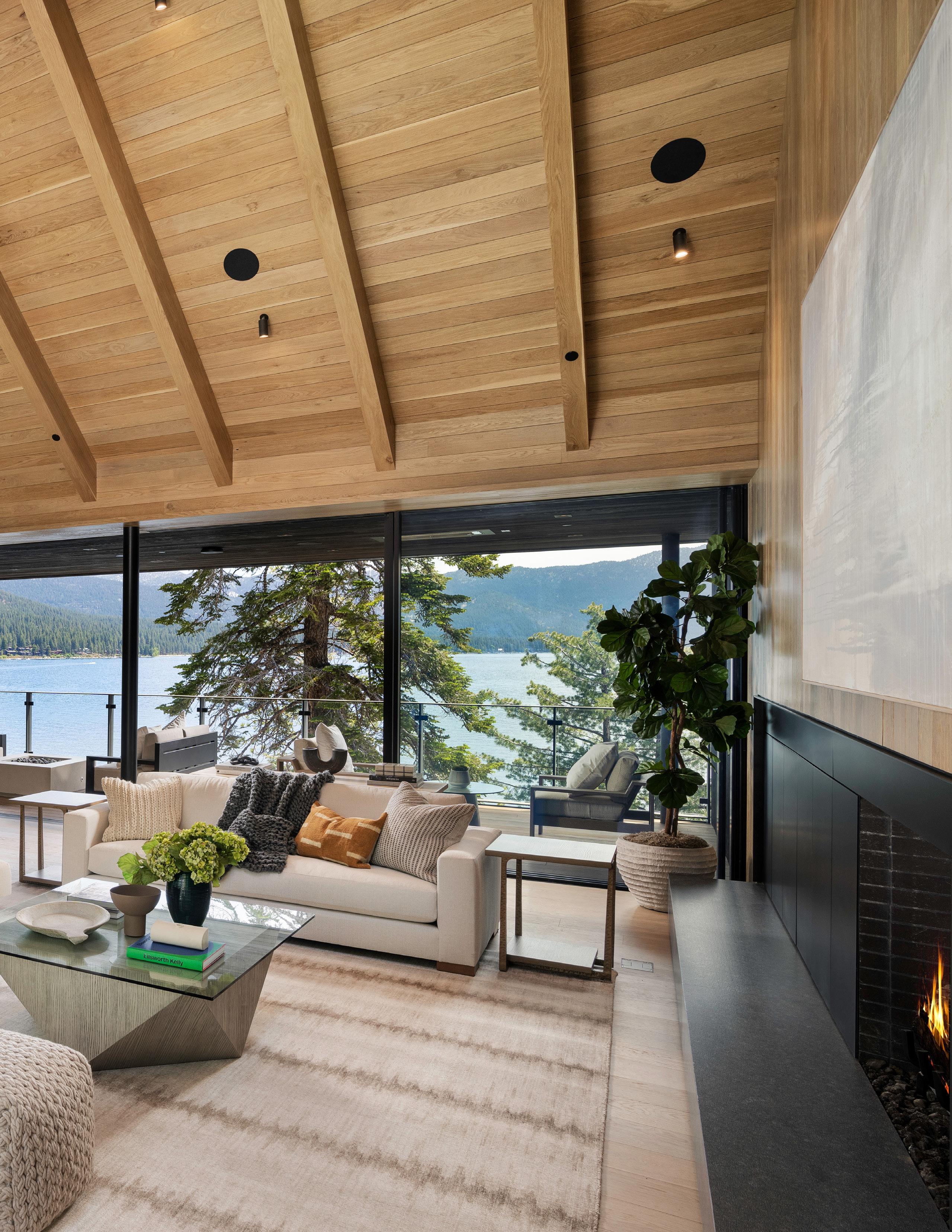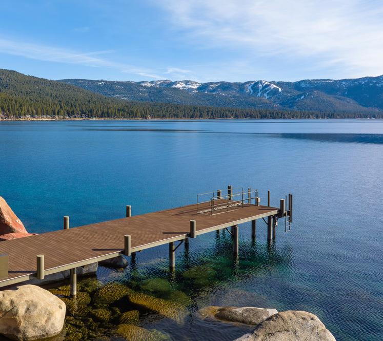 New lakefront construction with 100 feet of pristine shoreline on Crystal Bay, Nevada, Lake Tahoe. This contemporary 5-bedroom residence blends organic design with modern luxury. Panoramic lake views are showcased through floor-toceiling glass and skylights, flooding the interiors with natural light. Shared pier. Completion Spring 2025.