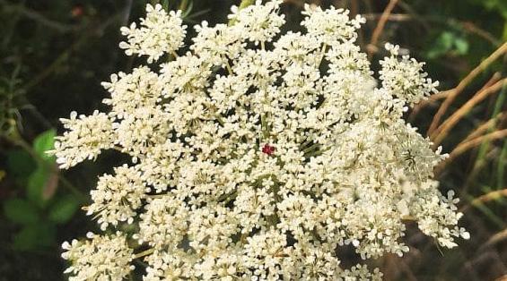 Queen Anne's Lace typically has a small dark red or purple flower in the center. With a pleasant carrot-like scent. Its umbrella is flat-topped with 3-prong shoots starting from the base. The stem is solid green and hairy. Shorter in height, being 2-3 feet tall. While the root is edible.