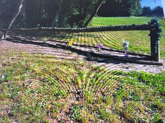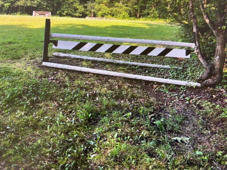 The black and white plank is jumpable in both directions and has relatively flat ground in the field on one side and a downward slope on the other side going into a trail through the woods. The height can be adjusted and it can be jumped in both directions, but I always start out with a lower height than the horse is used to when adding something new (such as irregular ground), then raise the jump, usually in 3" increments.