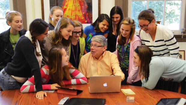 Little had I suspected the response from my students of, well, long ago. Last year was a watershed year for me: two former students showed up with daughters as prospective students. I remember myself thinking, Oh my goodness. This photo? The ninth-grade girls in one of my current sections of English 1 are looking at a photo (on my MacBook) that I had received just before class. The year of the cyberspace photo that we are looking at: 2003–2004, my first at the School. Sitting with me is a group of students including Schay Goss ’06, who is now Schay Barnhardt. She was a sophomore; she is now Assistant Director of Admission (with a husband, Hunter, who is Advancement Associate: Annual Fund and Special Gifts.)